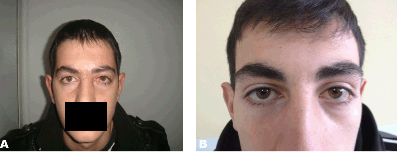 A 15-year-old boy was presented in our institution with a sudden onset of left eye, painful proptosis (4 mm on Hertel) with lateral globe displacement, visual loss (0.6 Snellen), restricted eye movement, diplopia. (Figure 1) No previous history about orbital disease, minor head trauma or upper respiratory tract infections. Anterior segment examination demonstrated diffuse subconjunctival hemorrhage which was located temporally. Bluish conjunctival lesions were associated with swelling involving the superior temporal quadrant. Fundus examination showed initial disc edema with choroidal folds in posterior pole. Patient underwent complete ocular examination, echographic and radiological evaluation. Echography documented retrobulbar mass with low internal reflectivity but highly reflective internal septa. (Figure 2) To establish diagnosis, computed tomography (CT) scan and magnetic resonance imaging scan of the orbit were done. CT scan and MRI (T1- and T2-weighed) scan showed lobulated intraconal mass (16x22 mm) located retrobulbar medially without contrast imbibition. (Figure 3A-B) Despite systemic steroid treatment during two weeks follow-up, the situation was worsened. Visual acuity was limited to 0.2, proptosis and intraocular pressure increased. Corneal exposure problems and relative afferent pupillary defect with manifest papilledema were also increased. As a result, we decided to perform orbital decompression under general anesthesia. The lesion was approached through a medial orbitotomy transconjunctival incision because it can give good access to the deep medial portion of the muscle con to evacuate blood and to make the subtotal resection of tumor. The conjunctiva is opened medially just anterior to the muscle insertion and Tenon’s capsule is separated from the sclera. A 6/0 Vicryl suture is woven horizontally through the muscle insertion 2 mm from its attachment to the sclera. After that we cut the muscle from the globe at its insertion and with scissors opened posterior Tenon’s capsule to expose the intraconal orbital space. We removed the tumor as much as possible, dissected carefully along its surface, and cauterized any vessels gently. We reattached the medial rectus muscle and closed the conjunctiva with running suture 8/0 Vicryl. Antibiotic with steroids‒tobradex drops was applied four times daily for seven days. The surgical treatment was successful. Pathological findings were suggestive of orbital lymphangioma. The postoperative course was uneventful with excellent aesthetic result and improvement of visual acuity (1.0 sc.) with the completely reduction of proptosis, changes in conjunctiva and the fundus of affected eye. (Figure 4A) The patient was discharged after six days. The patient has no shown changes even 27 months after the treatment. (Figure 4B) | ||||||