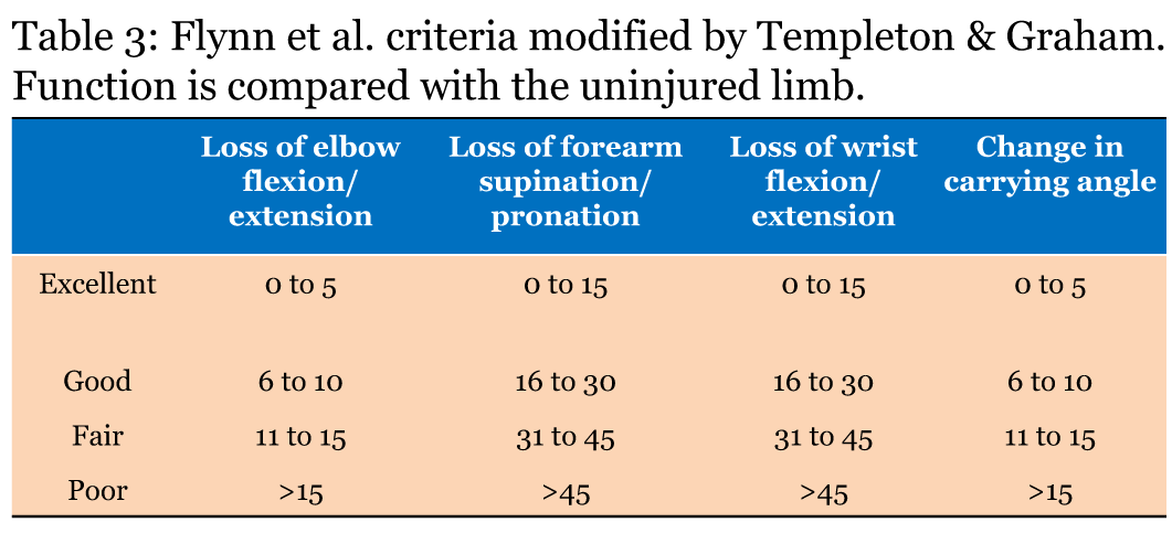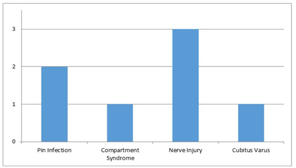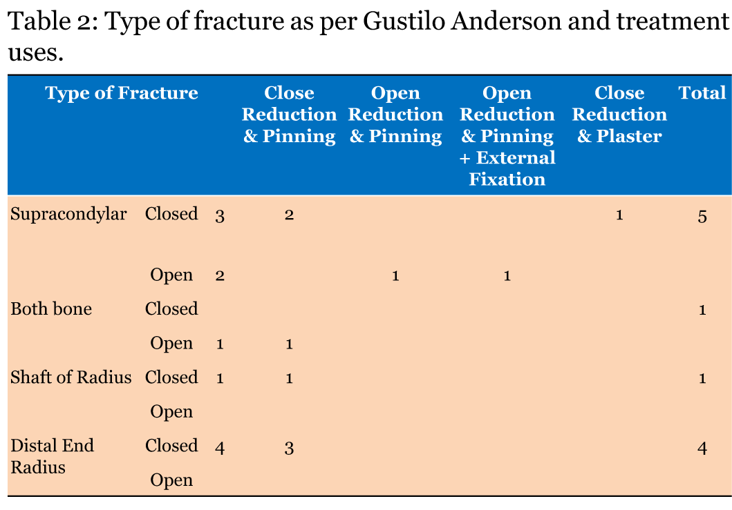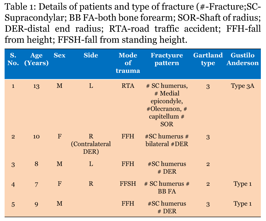Over a two-year period from September 2010 to September 2012 we conducted prospective analysis of 122 pediatric patients at Department of Orthopedics, Sheri Kashmir Institute of Medical Sciences, Srinagar with different musculo-skeletal injuries and came across five (4.09%) children with ipsilateral supracondylar humerus and forearm fractures. The five children were treated prospectively by closed reduction and percutaneous pinning/external fixation/cast fixation depending upon the fracture anatomy. There were three (60%) boys and two (40%) girls with a mean age of 9.4 years (range 7–13 years). The fractures were right sided in two (40%) and left-sided in three (60%). The cause of injury was a fall from a height in three (60%) cases, road traffic accident in one (20%) and fall from standing height in one (20%). Details of the patients are given in Table 1. There were three Gartland type-III and 2 Gartland type-II supracondylar fractures of the humerus. In the type-III injuries the displacement was posteromedial in four cases. There were four fractures of distal end radius in three patients (with one patient having bilateral injury), both bones of the forearm in one and of the radius alone in one patient. One patient with RTA with compound type 3B elbow injury had, in addition ipsilateral fractures of medial epicondyle, capitellum and olecranon. One patient had ipsilateral fractures of olecranon. Fasciotomy was performed in one patient with ipsilateral both bone forearm fracture who presented with compartment syndrome the type of fracture and treatment used is given in Table 2. One supracondylar fracture was classified as Gustilo Anderson compound type 3B, one supracondylar and one both bone fractures were classified as Gustilo type-1 open fractures. [18] All four distal end radius fractures were Salter Harris type 2 injuries. There were two median nerve injuries. Preoperatively, the radial pulse was absent in two patients. In these patients, the pulses returned after reduction. The forearm both bone (n=1) and proximal radial shaft fractures (n=1) were reduced and stabilized with K-wires. Three distal radial epiphyseal injuries were fixed with K-wires while one fracture was stabilized in plaster cast. The supracondylar fractures were then reduced by longitudinal traction and manipulation and fixed with two crossed K-wires; one lateral and one medial entry pins (in four (80%) patients). One patient with compound elbow injury needed external fixator in addition to cross K-wire fixation. One patient (20%) was managed with plaster fixation. The lateral pin is inserted first and must traverse the lateral portion of ossified capitellum, cross the physis, proceed up the lateral column and engage the opposite medial cortex. The medial pin is placed through the medial epicondyle and should traverse the medial column and engage the opposite lateral cortex. Care must be taken to protect the ulnar nerve. The elbow is placed short of 90 degree flexion. The nerve may be palpated if possible or a small 1.5 cm incision made over the medial epicondyle. Continuous fluoroscopy was used during reduction of the supracondylar fracture and pinning of both bone fracture. The pins were bent outside the skin to prevent migration and to make later removal easier and an above elbow slab was applied. One patient developed iatrogenic ulnar nerve palsy in immediate post-operative period which eventually recovered at three months follow-up. The two median nerve palsies also resolved with time. Postoperatively, an above-elbow long arm posterior plaster slab was retained for three weeks. The wires were removed from the elbow at 3–4 weeks and active exercises started. The wires were removed from the forearm six weeks after operation. Patients were recalled for a detailed clinical and radiographic evaluation at between 12 and 24 months from injury and were assessed for pain, stiffness and cosmesis. The range of elbow flexion-extension, forearm rotation, wrist flexion-extension and the carrying angles were measured by goniometers in both the injured and non-injured limbs. Radiographs were obtained of elbows, forearms and wrists. We performed a detailed neurovascular examination and compared the findings with those recorded on admission and after operation. The final outcome was graded according to a combination of Flynn’s criteria for isolated SC fractures and a grading of forearm rotation and wrist. [16] The mean follow-up time was 24 months (range 20–27). We found an incidence of combined fractures of 4.09%, which is similar to the incidence of 3–13% reported in other studies. The left upper extremity was more commonly affected than the right (3:2) and there was higher incidence of open fractures and nerve injuries; which is well documented in literature. Patients who suffered road traffic accidents had multiple fractures, some of which are open injuries. The patients were followed-up at second week, sixth week and third month by the operating surgeon. The final follow-up was at 24th months. Patients were examined for active/passive movements of the elbow and wrist (flexion-extension), measuring loss of motion, and the carrying angle loss (cosmetic factor). Following Flynn criteria, (Table 3) there were excellent results in three (60%) cases, good result in one (20%) case and poor results in one (20%) case. [16] One patient with open elbow injury and managed with external fixation developed stiffness of elbow and had less than satisfactory results. There were no cases of failure of fixation and no delayed union or nonunion. We had one case with cubitus varus in a patient managed with closed reduction and plaster. There were two superficial pin-track infections, one in supracondylar and one in forearm region which healed after removal of the wires. The nerve injuries were all temporary and recovered by final follow-up. There were one iatrogenic ulnar nerve injuries that resolved with pin removal. | ||||||