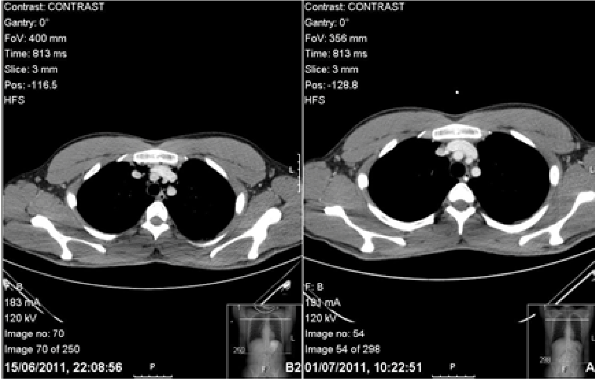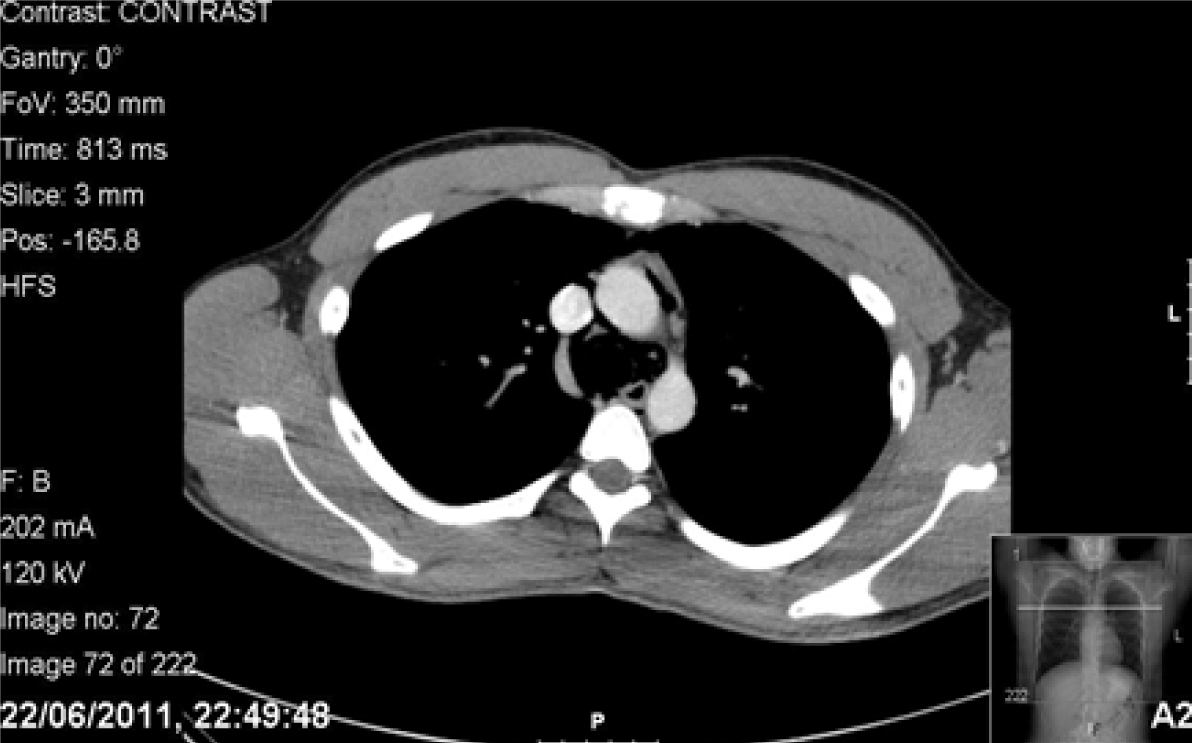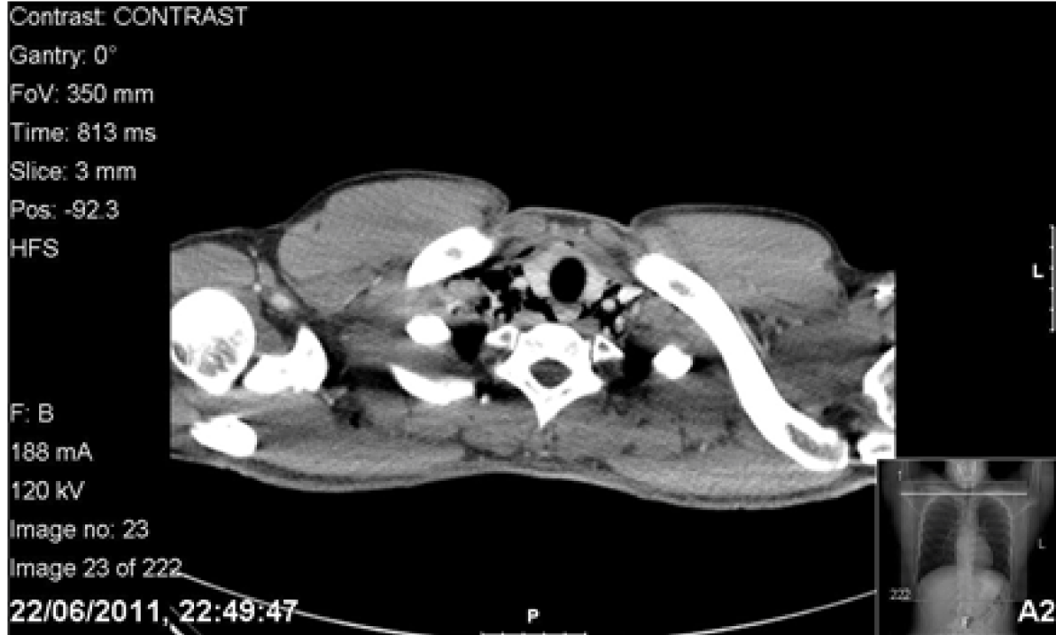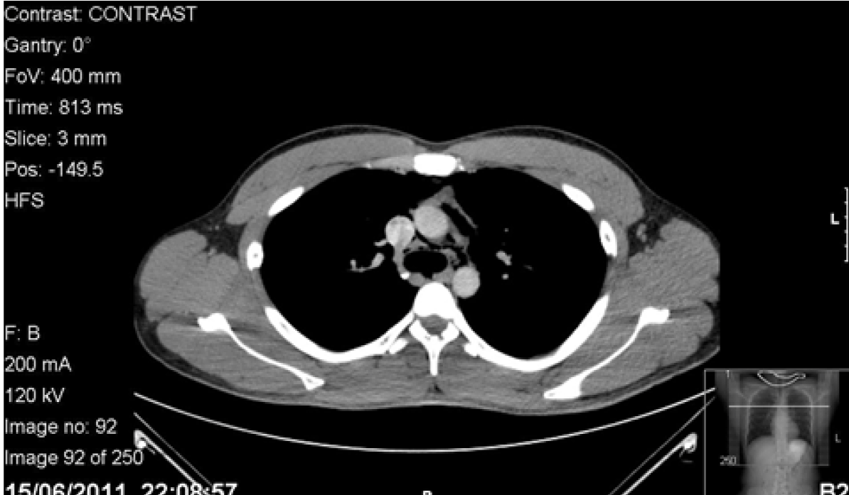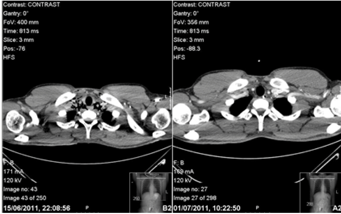 A previously well 24-year-old final year male medical student presented with central chest pain. On morning of his medical finals, he was nervous and vomited once and wretched seven times. He then coughed and experienced a sharp sudden onset retrosternal chest pain which was constant in nature and rated 6/10 in severity. The patient attended his exam, during which he experienced the uncomfortable feeling of crackling down his throat while ingesting water. He felt unwell after his exam and was unable to fully inspire due to on-going chest pain. The patient palpated his neck which felt like ‘bubble wrap’. He then auscultated his chest himself and found his heart sounds resembled crackles (Hamman’s crunch). The patient’s housemates concurred with the findings, so he attended Accident and Emergency department and was seen by the general physician triage. The patient’s past medical history included asthma. He had a history of smoking five cigarettes a day with moderate alcohol intake. Observations were unremarkable. The general physician found no abnormality after auscultating his chest and palpated lymph nodes on neck examination. Throat examination revealed erythema. Despite the patient’s and his accompanier’s reservations, the general physician diagnosed a viral infection and advised to return in five days if his symptoms would not improve. The patient returned home. However while taking his dinner, he experienced severe odynophagia describing the sensation like ‘swallowing glass’. The following day, his symptoms persisted so he consulted his surgical tutor whose registrar palpated the subcutaneous emphysema in his neck with no lymphadenopathy. An urgent X-ray of the neck revealed air in the subcutaneous tissues. Computed tomography (CT) scan of chest with contrast and Gastrografin swallow revealed a small leak outside the esophagus and pneumomediastinum. (Figure 1) Blood tests were unremarkable. The patient was transferred to a tertiary upper gastrointestinal centre with suspected Boerhaave’s syndrome. The tear was thought to be in the upper third of the esophagus. He was kept nil by mouth, supplemented with intravenous fluids and given prophylactic daily intravenous tazocin, metronidazole and fluconazole. Gastrografin swallow on the fifth day revealed no obvious leak, his symptoms had resolved. The patient was discharged with advice of a liquid diet for one week building to solids slowly thereafter. The patient’s symptoms returned spontaneously two days post discharge on the eve of his surgical finals. Subcutaneous emphysema was found on examination. Observations, blood tests and arterial blood gas (ABG) showed no abnormality. Computed tomography scan of chest with IV contrast and Gastrografin swallow showed pneumomediastinum but no leak of Gastrografin. (Figure 2) (Figure 3) Furthermore, there was the dilemma of whether he would be able to sit his exam which was at the same tertiary centre. He was given a stat bag of intravenous fluids, the aforementioned intravenous antibiotics, kept nil by mouth and allowed home to rest. He was admitted directly after his surgical finals and treated conservatively. Nutritional support was given via a nasogastric tube which was inserted under radiological guidance. The patient’s symptoms improved and a Gastrografin swallow study on day-10 was normal. Soft diet was commenced which he tolerated. The patient’s second hospital stay was 12 days. He continued with a fork mashable soft diet until his three month follow-up, which was satisfactory, returning to a normal diet thereafter. Thankfully, the patient passed his finals and continues to work as a doctor. (Figure 4) (Figure 5) | ||||||