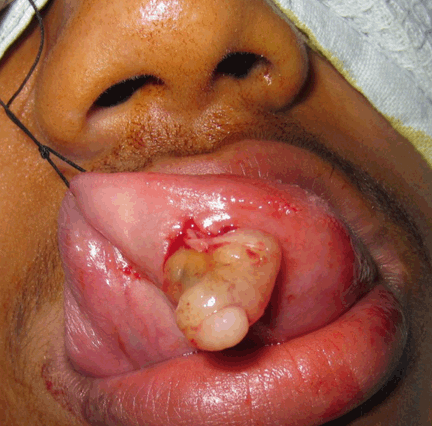 A 15-year-old child came to our Department of oral and maxillofacial surgery, Govt. Dental College, Kozhikode complains of swelling over ventral surface of tongue since two years. (Figure 1) Patient had no history of any change in size the of lesion. Patient had no difficulty in chewing, swallowing and phonation and there was no sensory or taste abnormalities by the patient. Color of overlying mucosa was normal. Patient was only concerned about the swelling which was totally asymptomatic. The past medical history of the patient was unremarkable. On clinical examination a 1.5-cm diameter mass was present on ventral surface of tongue just beneath the mucosa. The lesion had rubbery consistency, was freely moveable, non tender and asymptomatic. Rest of the oral cavity was normal. Clinically, the lesion appeared to be a benign soft tissue neoplasm. Surgical excision of the lesion was done under local anesthesia with adequate surgical margins (Figure 2) after giving bilateral nerve block. During excision lesion was well circumscribed and encapsulated with no infiltration in the surrounding tissues. After excision tissue was sent for histopathological examination. Grossly the mass was well encapsulated, measuring 1.5 cm in diameter and had firm gray white cut surface with small cystic areas. The patient has not shown any recurrence in follow-up period of two years. | ||||||