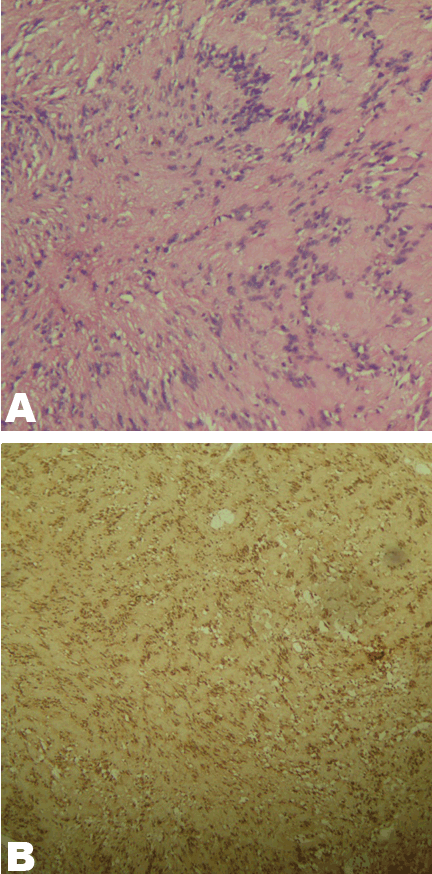 Schwannomas are benign nerve sheath neoplasms composed of schwann cells. They were first described by Verocay in 1908. Embryologically, schwann cells arise during fourth week of development from a specialized population of ectomesenchymal cells of neural crest. [2] These cells form a thin barrier around each extracranial nerve fibres of motor and sensory nerves with myelin sheath to enhance nerve conductance. Schwannomas being rare in oral cavity, and is not often encountered in clinical practice. Diagnosis is confirmed by microscopic examination. (Figure 3A) Two microscopic patterns of schwannomas are known to coexist: Antoni A and Antoni B. In Antoni A, elongated cells with cytoplasmic processes are arranged in fascicles in areas of moderate to high cellularity with little stromal matrix. [5] Spindle shaped nuclei are aligned in parallel rows forming a typical palisaded pattern. Between the rows of cells there are fine cytoplasmic fibrils with acellular, eosinophilic masses called Verocay bodies. [3] In Antoni B, the tumor is less densely cellular with a loose meshwork of cells along with microcysts and myxoid changes similar to neurofibroma. [6] In both patterns, the cytology of the individual cells is similar, with elongated cytoplasm and regular, oval nuclei. S-100 protein was strongly reactive in the spindle cells (Figure 3B). Degenerative changes in schwannomas can occur and include nuclear pleomorphism, xanthomatous change and vascular hyalinization. [6] Robert et al. have documented a schwannoma in a 30-year-old woman arising in the tip of tongue. [2] Lopez and Ballestin in their study of nine intraoral schwannomas found three schwannomas in vestibule, two each in tongue and palate and one each in floor of mouth and lower lip. [5] The main differential diagnosis clinically are other benign lesions which may occur at this site. These include neurofibroma, traumatic neuroma, fibroma, lipoma, leiomyoma etc. Diagnosis of the lesion can only be confirmed by histopathological examination and immunohistochemistry. Malignant transformation of schwannoma is exceptionally a rare event. Treatment of the lesion is complete surgical excision. | ||||||