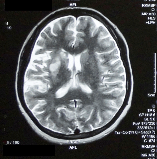 A 24-year-old female, with previous cesarean section in her third trimester, suddenly developed weakness of left side of the body and deviation of face to the right. She was brought to the emergency, examination revealed stable vitals (pulse 90/min, regular, blood pressure 130/84 mmHg, supine), altered level of consciousness (Glasgow coma scale 10), and left sided hemiparesis (power 2/5 in both upper and lower limbs). Deep tendon reflexes were brisk and Babinski sign was present, associated with upper motor neuron palsy of the left facial nerve. Other systemic examination was normal. There was no history of head trauma, fever, unconsciousness or seizure. She did not have any skin rash, arthritis or signs of deep vein thrombosis. There was a history of vertigo, unconsciousness, lower limb weakness, with recovery within an hour, 4 years back for which she received no treatment. There was no history of prior fetal loss. An urgent non-contrast magnetic resonance imaging scan of brain was done which showed acute infarct in right centrum semiovale and right gangliocapsular region in the right middle cerebral artery territory. (Figure 1) Patient’s complete hemogram, liver function tests, serum creatinine and electrolytes were normal. Abdominal ultrasound showed a single, live fetus with normal parameters. Echocardiography was normal. She had normal prothrombin and activated partial thromboplastin time. The patient was seronegative for hepatitis B, C and HIV. Antinuclear factor by indirect immunofluorescence method was negative. Anticardiolipin antibodies, antineutrophil cytoplasmic antibodies (pANCA and cANCA) were negative. Blood homocysteine level, Lupus anticoagulant screen time was normal. Mutation of factor V could not be detected by real time polymerase chain reaction. Protein C (0.9 mg/L, reference range 1.67–3.16 mg/L) and protein S (7 mg/L, reference range 55–123 mg/L) levels were low. She was diagnosed as a case of protein C and protein S deficiency and was started on low molecular weight heparin (60 mg intravenously twice daily) for 10 days. It was stopped 24 hours prior to elective cesarean section with patient’s International normalized ratio 2.0. A three-kilogram healthy male baby was delivered. After 4 hours of cesarean section, low molecular weight heparin (60 mg subcutaneously once daily) was restarted. Subsequently, the patient was maintained with oral anticoagulant (2 mg once daily) with an overlap period of 3 days with a target International normalized ratio of 2.53. |