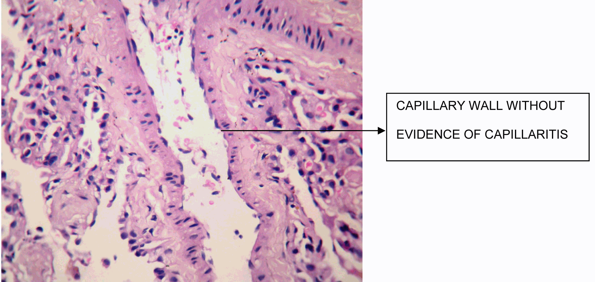 A 38-year-old female, presented to our emergency room with progressive breathlessness (MMRC grade 2- 4) and dry cough for three months. She had history of multiple blood transfusions elsewhere during the prior three months period. She had no history of hemoptysis, hematemesis, menorrhagia, bleeding per rectum or any other obvious focus of bleeding. There was no history of fever. She had no symptoms related to connective tissue disorder. She was not a known smoker and had no history of exposure to toxic gases and fumes. She had no history of exposure to any drugs. Physical examination in the emergency room revealed the temperature to be 370 °C, pulse rate 130 beats/minute, Blood pressure 130/80 mmHg, Respiratory rate 60/minute and SpO2 was 56% on room air ventilation. Her palpebral conjunctiva was pale. On auscultation fine end inspiratory crackles were heard bilaterally in all lung fields. Physical examinations of other systems were found in normal limits. Arterial blood gas analysis of the patient showed Ph 7.46, PCo2 30 mmHg, Po2 37 mmHg, SpO2 77 mmHg (P/F ratio of 0.37). Her serum d-dimer done within two hours of admission was low. Electrocardiography and echocardiogram were normal. Her total counts were also normal. She was admitted in intensive care unit (ICU) and was treated with non invasive ventilation and high flow oxygen. Subsequent investigations revealed corrected reticulocyte count 0.5%, microcytic hypochromic peripheral blood smear, low serum iron (36 μg/dL), low transferrin saturation (28%), normal Ferritin (140.2 ng/mL), normal total iron binding capacity (415 μg/dL) and normal serum vitamin B12 and folic acid levels. Her stool was negative for occult blood or parasites. Her serum creatinine was 0.8 mg/dL, blood urea was 36 mg/dL and urine microscopy was normal (no protein or red blood cells). The liver function tests and coagulation profile were within normal limits. Her retroviral status (HIV I and II by ELISA), hepatitis B surface antigen and hepatitis C antibody were negative. She received one pint blood transfusion in the ICU. Her chest X-ray (Figure 1) which was done in the ICU showed bilateral reticular infiltrates. Computed tomography (CT) scan of thorax was subsequently done which showed bilateral extensive ground glass opacities with interstitial thickening and nodules. (Figure 2) A provisional diagnosis of acute interstitial pneumonia/diffuse alveolar hemorrhage was made and she was started on broad spectrum antibiotics with high dose pulse steroids (Inj methylprednisolone 500 mg i.v. daily in divided doses for 3 days). Within 3 days she improved significantly and was weaned off the non invasive ventilator support. Later the steroids were tapered to oral prednisolone at 0.75 mg/kg body weight. Subsequently fibre optic bronchoscopy was done under local anesthesia with conscious sedation. Sequential broncho alveolar lavage (BAL) was done from right middle lobe, it showed increasing hemorrhagic returns of BAL aliquots and BAL counts showed 60% hemosiderophages, (Figure 3) confirming the diagnosis of diffuse alveolar hemorrhage. BAL was negative for gram stain and culture showing no evidence bacterial pathogens, acid fast bacilli, fungal organism, Fluorescent antibody stain for Pneumocystis jeroveci and cytology for cancer cells. Transbronchial lung biopsy was done from right middle and lower lobes. It showed interstitial fibrosis, hemosiderin laden macrophages in alveolar spaces and interstitium with positive Perl’s stain. (Figure 4) There was no evidence of vasculitis (capillaritis), granulomas, organising pneumonia and malignancy in the biopsy specimen. Her serum Rheumatoid factor (RF), antinuclear antibody (ANA), Double stranded Deoxyribonucleic acid (DsDNA), antiphospholipid antibody(APLA), Anti Glomerular Basement Membrane antibody (anti GBM) and anti U1 RNP were negative. Serum Complements (C3, C4 and Total Complement) and Antineutrophilic Cytoplasmic antibodies(c and p ANCA) were in normal range. After one week of treatment with steroids, she improved and there was no further drop in hemoglobin. At this time spirometry was done and it was normal. Her chest X-ray and CT thorax repeated after one month showed complete clearing of the shadows. (Figure 5) | ||||||