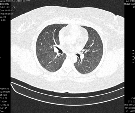 The entity of IPH was initially described by Virchow [7] in 1864 as “brown lung induration”. Waldenstrom [8] established the first ante mortem diagnosis in 1944. There are a few aetiological hypotheses of IPH including genetic, autoimmune, allergic, environmental and metabolic theory. [9] Environmental exposure to fungi (especially Stachybotrys atra) in water-damaged houses has been mentioned to cause IPH. [10] The clinical course includes two phases. First, an acute phase “IPH exacerbation”, corresponds to intra-alveolar bleeding episodes, manifested by cough, dyspnea, hemoptysis and sometimes respiratory failure. Almost 100% of the adults experience hemoptysis during the disease course. [9] Secondly, the chronic phase is characterised by a slow resolution of previous symptoms, with or without treatment. The alternation of the two phases is largely unpredictable. Our patient never had hemoptysis. The diagnosis of IPH is difficult, it requires the exclusion of other diseases which can be associated, such as cardiac diseases, bleeding disorders, connective-tissue diseases (systemic lupus erythematosus and rheumatoid arthritis), systemic vasculitis (Wegner’s granulomatosis or microscopic polyangiitis), or anti-basement-membrane-antibody diseases (Goodpasture’s syndrome). Laboratory analysis for ANCA, anti-GBM, antiphospholipid antibody, ANA and RF should so be negative. In our patient, they were all negative. Association of IPH with celiac disease has been mentioned in literature. [11] However, we have not done serum antigliadin, antireticulin and cow-milk precipitins as she had no symptoms suggestive of celiac disease or milk allergy. Goodpasture’s syndrome can present with or without pulmonary capillaritis, [3] diffuse alveolar hemorrhage resulting from antibasement membrane antibody disease is usually associated with glomerulonephritis. [1] Immunofluorescence of transbronchial lung biopsy specimen was not done as she had no glomerulonephritis and serum anti GBM antibody was negative. Based on the clinico- radio- pathological interpretation, we feel that the findings are consistent with idiopathic pulmonary hemosiderosis. A number of therapeutic trials have been tried, including: (1) splenectomy, without significant results (there is no evidence of hypersplenism), and (2) systemic glucocorticoid, commonly started in the acute phase of IPH, with apparent good control and impact on mortality. [1] Among immunosuppressants, azathioprine in combination corticosteroids might be the best therapeutic regimen, especially in preventing IPH exacerbations. [12] Adults with IPH seem to respond more favorably to oral corticosteroid therapy [6] than children, in whom treatment can be problematic. The recommended starting dose is 1 mg/kg/day prednisolone for two months, until the new alveolar infiltrates tend to resolve. [13] [14] In our patient, there was complete radiological clearing at four weeks and repeat CT thorax after four weeks showed no new infiltrates. We treated our patient with oral prednisolone 0.75 mg/kg body weight for 4 weeks, followed by 0.5 mg/kg body weight for another 8 weeks and 0.25 mg/kg body weight for another 12 weeks (Total duration of 6 months). We had planned to add azathioprine if she had recurrence or exacerbation. She is in our regular follow-up and has no recurrence of her symptoms. The long-term prognosis of the disease remains poor, and death may be due to massive diffuse pulmonary hemorrhage or chronic respiratory failure because of pulmonary fibrosis. [11] | ||||||