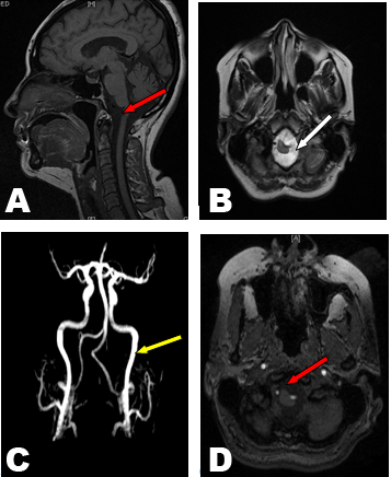 A 40-year-old Sudanese female was referred to the magnetic resonance imaging (MRI) department presented with upper limbs weakness, urine incompetence and general weakness evaluation. Brain MRI axial and sagittal T1, T2, post contrast series, fluid attenuation inversion recovery (FLAIR), magnetic resonance angiography (MRA) were done. Images show anomalous left vertebral artery impressing into the cord substance at cervico–medullary junction causes cervico-medullary stenosis, no evidence of cerebral tonsil herniation or syrinx formation, in right parietal sub cortical white matter; two small high signal intensity foci were seen on T2 and FLAIR images suggestive of ischemic foci. Brain MRA confirmed malformation in the left vertebral artery, images of MRA showed the left vertebral artery entering foramen magna with medial tortuous kinking to the medulla oblongata. Normal MRI scan appearance of the basal ganglia, thalami, internal and external capsule on both sides were detected also the ventricular system and extra axial cerebrospinal fluid (CSF) space are within normal limits, no mass effect or midline shift. Normal configuration of optic chiasm, optic nerves, pituitary gland and its stalk, Normal features of the cerebellar hemispheres, vermis, peduncles and brain stem with no abnormal intensities. Normal MRI features of the cerebello pontine angles and internal auditory canal, no evidence of space occupied lesion (SOL), fresh or sub dural collection was detected. (Figure 1) |