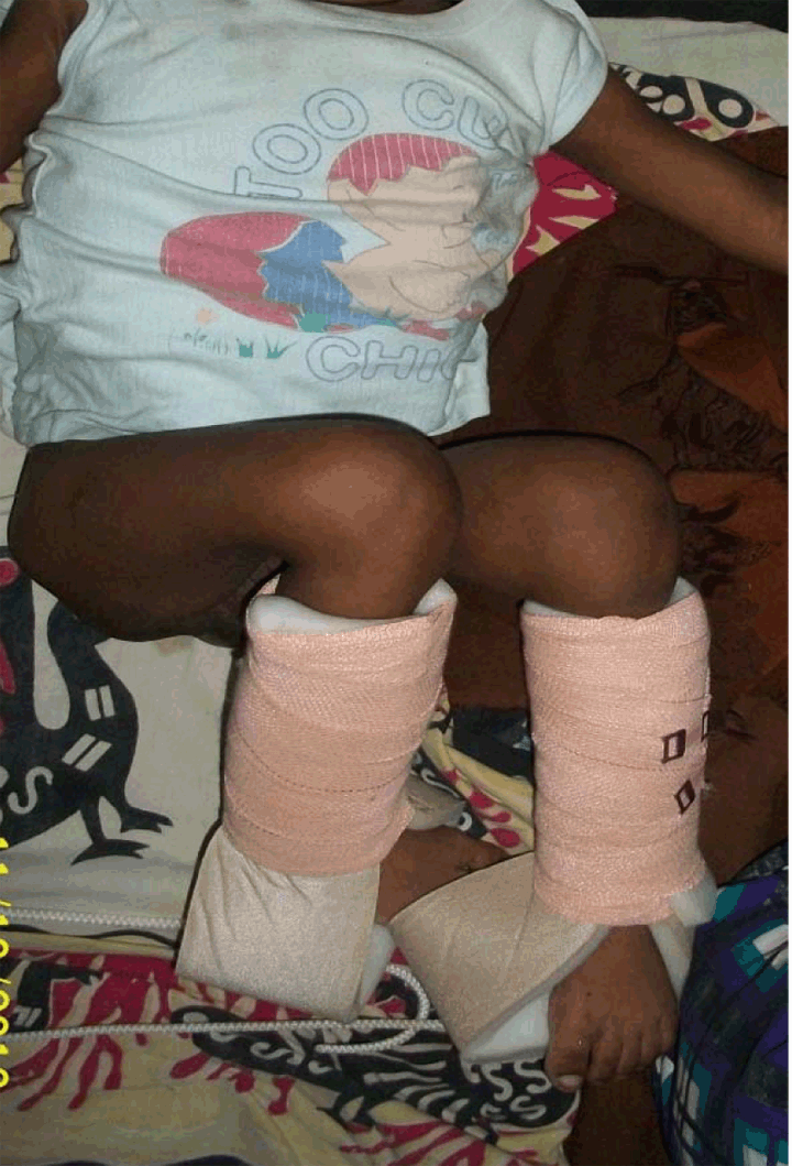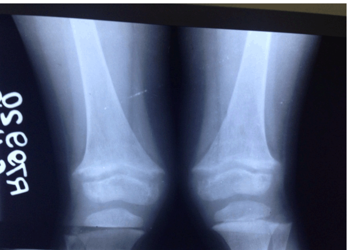 We herein present a case of a six-year-old boy, presented to us with mild knee and thigh swelling of left side and inability to walk for one month. Child's parents gave history of fall from height of about 4–5 meter, 1 month back, following which patient was unable to stand and complained of pain in bilateral knee. There was history of massage and visits to professional bone setter. No history of any medical intervention was elicited. No history of bracing or plaster cast immobilization was given. On examination, tenderness was present in bilateral thigh. Patient was bed ridden for one month. No abnormal mobility or crepitation was seen. There was swelling in bilateral distal thigh, left more than right. Range of motion at hip was normal. There were bilateral flexion deformity of about 20 degrees with further movement painful and attempt of any movement caused muscle spasm. (Figure 1) Radiographs of bilateral knees were taken. (Figure 2) These demonstrated bilateral Salter–Harris type 1 physeal injuries. Routine laboratory investigations were essentially normal except for anaemia (hemoglobin 9.8) and mildly raise alkaline phosphatase (ALP-564). Calcium profile was normal, so were serum vitamin C levels (0.84 mg/dL). Since patient came to us after one month of injury, fracture was already in the stage of healing and was not mobile. Therefore, closed manipulation could not re-align the physis. Open reduction could further damage the physis in the growing child. So the child was managed conservatively on long leg cast and non-steroidal anti-inflammatory drugs (ibuprofen 100 mg b.d.) for two weeks. After pain decreased, patient was given intermittent skin traction for flexion deformity with range of motion exercises. Both slips healed within four months. Even these completely displaced slips remodeled very well. At six month of follow-up, all the slips were completely remodeled without obvious deformity. (Figure 3) Patient gained bilateral excellent range. | ||||||