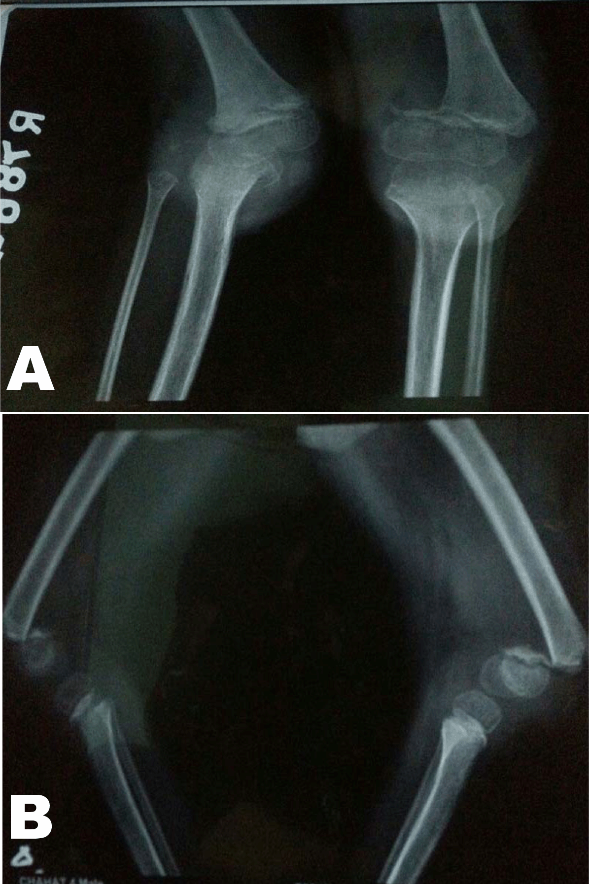 The distal femoral epiphysis is the largest and fastest growing epiphysis in the body. There is no inherent protection to the physis with all muscles and ligaments inserting directly to the epiphysis. Distal femoral injuries account for 7% of all pediatric trauma. [1] Distal femoral physeal injuries are even more rarer accounting for 1–6 % of all physeal injuries and less than 1% of all fractures. Among these most common is Salter–Harris type 2 injuries. Salter–Harris type 1 injuries of distal femur are very rare accounting for a mere 7.7% of all distal femoral injuries. [2] [3] Also these injuries are common in new-borns or adolescents. [3] Direct trauma to distal femur is uncommon mode of injury but may occur in road traffic accident or with falls. Such injuries are mostly seen in adolescents. In newborns, it is mostly due to birth trauma secondary to breech injury. Indirect injuries are most common mode of injury, mostly varus or valgus strains resulting in simultaneous compression of one side with distraction of other cause physeal separation. Most typically these are Salter–Harris type 2 with separation beginning in tension side and exiting from metaphysis of compression side. In most cases patients present with history of trauma with inability to bear weight on affected extremity. The knee is typically in flexion owing to hamstring spasm. Mostly the epiphyseal displacement is in the coronal plain producing a varus or valgus deformity. This is confirmed by a plain radiograph and treatment consists of closed manipulation followed by a long leg cast till fracture healing. In fractures which fail to reduce or with unstable reductions may be taken up for open reduction with 4.0 or 6.5 mm screws. A bilateral distal femoral Salter–Harris type 1 injury has never been reported in literature. Multiple slips have been reported in metabolic disorders like scurvy, [4] or conditions causing generalized bone weakening like leukemia or myelodysplasia. However, we herein present one case of a six-year-old year male child with bilateral traumatic distal femoral slips with normal metabolic parameters. | ||||||