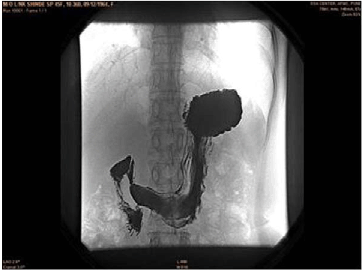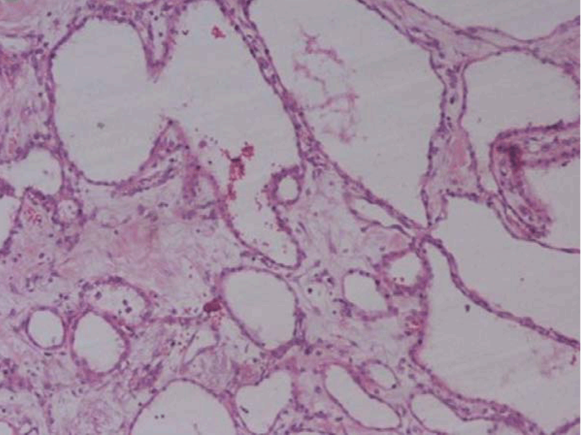 A 54-year-old female was presented with pain in epigastric region of six months duration and nausea, anorexia, weight loss and lump in mid upper abdomen of two months duration. On admission to the hospital, chest and abdominal X-rays were performed which were inconclusive. Routine laboratory studies including hematological and biochemical parameters were normal. Serum amylase was within normal limits. Following this an ultrasound of the abdomen was performed. Ultrasound showed a well-delineated, multi-loculated, cystic lesion of size 5.2x6.2x7.7 cm in the body of the pancreas. The cysts were all subcentimetric giving a honeycomb appearance to the lesion. (Figure 1) Subsequently, a barium meal study was done which showed a smooth extrinsic indentation on the lesser curvature of the stomach. (Figure 2) Contrast-enhanced computed tomography scan showed a large, lobulated, well defined, lesion with multiple subcentimetric non enhancing hypodense cystic areas with enhancing hyperdense walls in the body of pancreas. (Figure 3) Multiple discrete foci of calcifications were seen within the lesion. (Figure 4) Anteriorly the lesion was reaching till anterior abdominal wall, posteriorly it was abutting the splenic vein, superiorly it was abutting the segment IV of liver and inferiorly it was abutting lesser curvature of stomach. After complete investigations, patient was diagnosed as a case of cystic tumor of pancreas and she was operated upon with resection of the lesion. Histology of resected pancreatic tissue revealed multicystic lesion in the body of pancreas containing cysts less than 1 cm in size lined by small flat to cuboidal cells. (Figure 5) There was no architectural or cytological atypia noted. Based on the imaging findings and further confirmation by histopathology a diagnosis of serous cystadenoma of pancreas was made. | ||||||