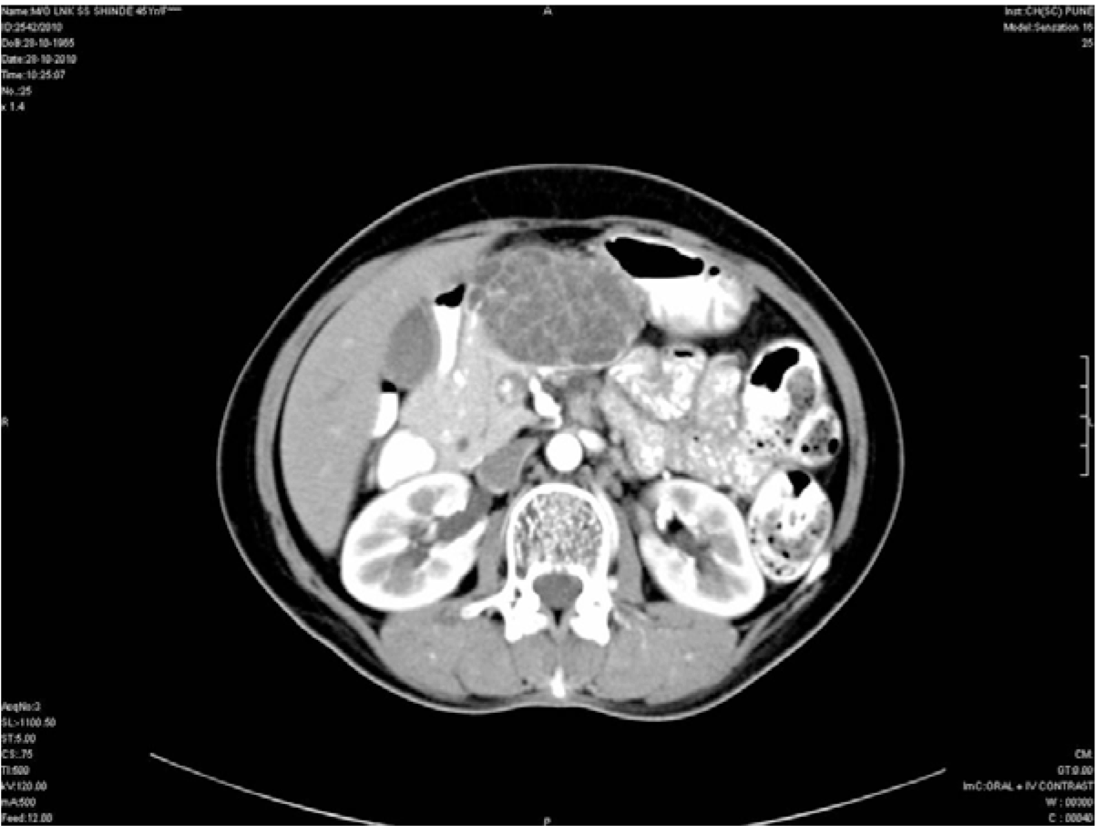Serous cystadenomas are benign tumors of the pancreas. There is strong female predominance with a sex ratio of 2:1. The most common presenting symptom is vague abdominal pain. A palpable epigastric mass is present in nearly two thirds of cases. Serous cystadenomas constitute 25% of all cystic tumors of the pancreas the majority of which are found in females. [1] The most common site of serous cystadenomas is the head and tail of pancreas. In our case, the lesion was present in the body of the pancreas. They are seen almost exclusively after 35 years of age and 82% occurs after 60 years of age. The diagnosis of serous cystadenoma can be done by various imaging modalities such as ultrasound, computed tomography (CT) scan, and endoscopic ultrasound. On CT scan 30% of cases have a fibrous central scar with or without a characteristic stellate calcification which is considered pathognomic for serous cystadenoma. [2] On contrast-enhanced CT scan, there is enhancement of the septae. [3] Serous cystadenomas have three morphologic patterns: polycystic, honeycomb, and oligocystic. [4] In 70% of cases, serous polycystic adenomas consist of a collection of cysts (usually more than six) which range from a few millimeters up to 2 cm in size. [5] On non-contrast CT, they appear as hypodense, cystic masses that frequently show calcifications. [6] The honeycomb pattern, seen in approximately 20% of patients, is characterized by numerous subcentimeter cysts that cannot be individually distinguished by cross-sectional imaging. Therefore, cysts having the honeycomb pattern are seen as well defined lesions with soft-tissue attenuation seen on CT. [7] Oligocystic have fewer larger cysts which are usually greater than 2 cm in diameter. Differential diagnostic features that help in distinguishing serous from mucinous cystic tumors include older age group, and presence of multiple (>6) small cysts in case of serous cystadenoma as opposed to mucinous cystadenomas in which cysts are larger and fewer in number. Patients with serous cystadenoma are thought to have an excellent long-term prognosis. Hence is important to differentiate serous cystadenoma from other cystic tumors. | ||||||