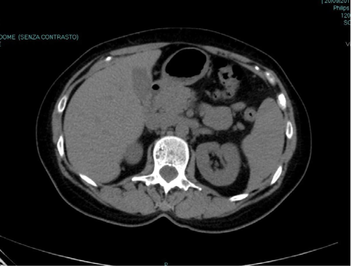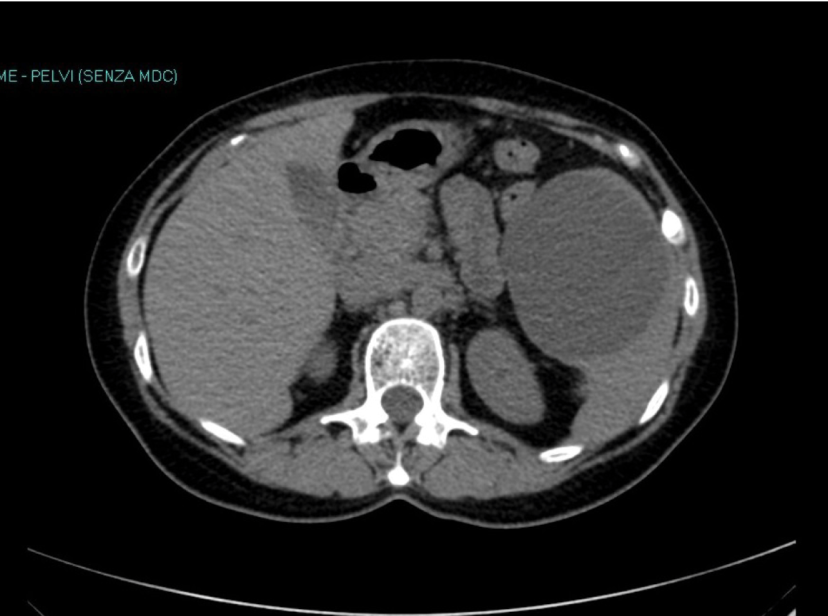 A 42-year-old female (anesthetist by profession) presented with sudden onset of upper left abdominal pain, left loin pain and left lower chest pain, without any history of trauma, even minimal. She did not complain of any urinary or bowel symptom and had never seen blood in her urine or stools. She had no angina-like pain or any breathing problem. Her past medical history was completely unremarkable and she had not had any trip abroad in the last five years. General conditions were good and vitals were normal. Physical examination revealed an area of tenderness at the upper left quadrant of the abdomen, without any guarding or rebound, where a deep mass could be palpated. Urine test and culture were negative. Blood test showed no abnormality, in particular no anemia or eosinophilia. Serologic tests for parasites were negative. Ultrasound scan revealed an 8-cm cystic mass of the spleen but no free fluid. Computed tomography (CT) scan (Figure 1) confirmed the presence of an 8-cm cyst of the medial aspect of the spleen without any other relevant abdominal finding. The cyst was apparently simple and thin-walled, without any internal sept or vegetation. The CT scan was unenhanced as patient declined contrast. Following the guidelines, we proposed a laparoscopic total or partial splenectomy, depending on the intraoperative findings, to avoid complication as rupture or infection. After an in-depth discussion with the patient, she was adamant that she would like to avoid any surgery, even laparoscopic. For this reason we agreed to adopt a wait-and-see strategy. She was monitored for 24 hours in the surgical ward, than discharged. Pain subsided gradually in a week or so. Three months later, a repeat CT scan (Figure 2) revealed that the cyst had completely disappeared. Now, more than 2 years after that episode of pain, the patient is completely fine and asymptomatic. A recent ultrasound scan confirmed the absence of any splenic cyst. | ||||||