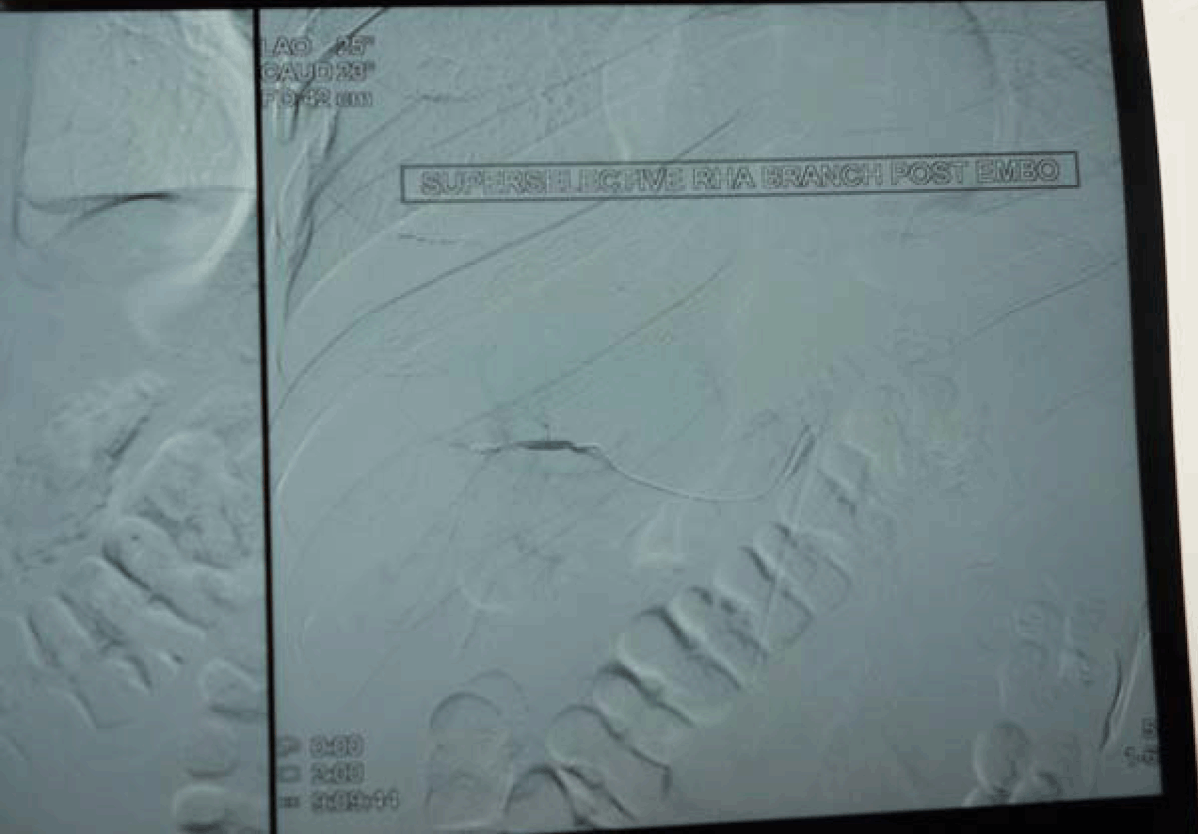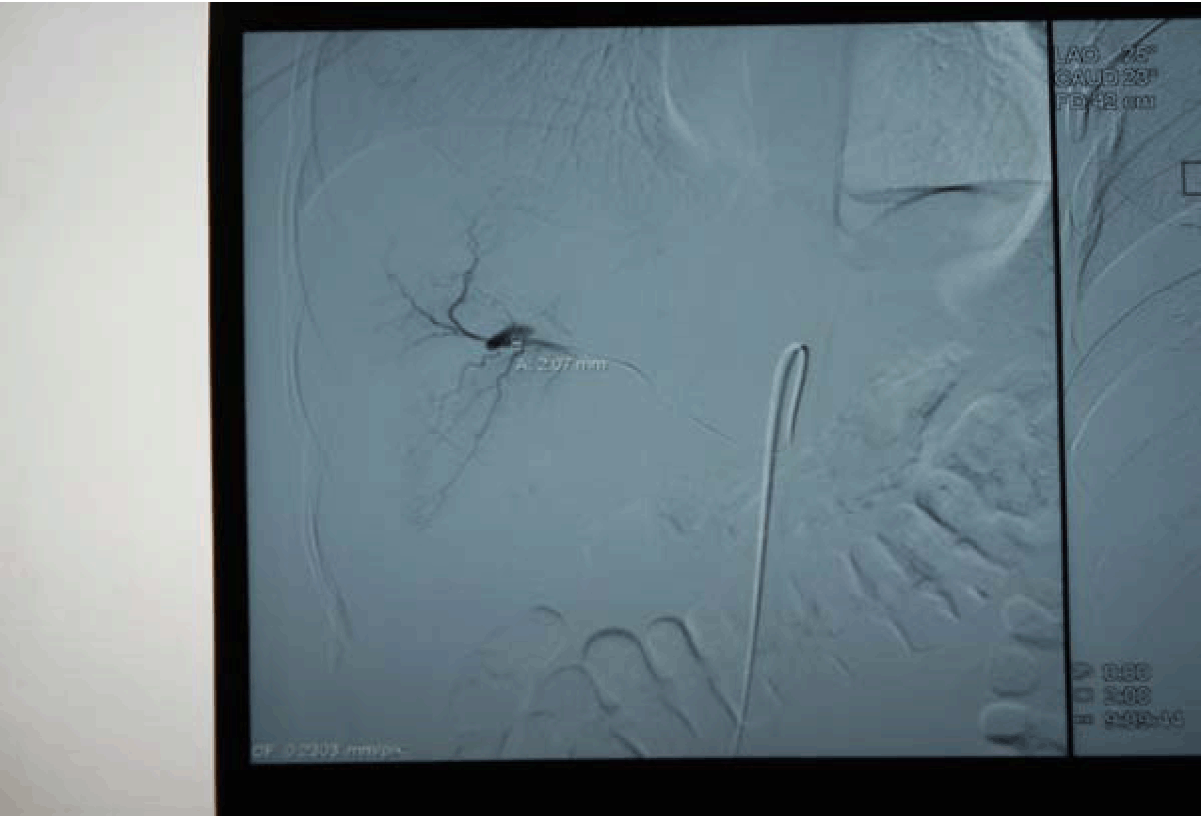 A 27-year-old male presented with complaints of one episode of hematemesis seven days back and melena for seven days. There was a history of roadside accident one and a half months before with grade IV liver injury, revealed on computed tomography (CT) scan of the abdomen. Patient was managed conservatively in Department of Surgery and discharged from hospital after one week in stable condition. On examination, the patient was anemic, pulse 110/min, blood pressure 80/50 mmHg with postural fall in blood pressure. The systemic examination was normal. Clinical possibility of upper GI bleed was kept. Emergency investigation revealed hemoglobin 4.5 g/dL, TLC 4900/mm3. BU 30 mg%, S. cr.-1.0 mg%, and electrolytes Na-135 mEq /L, K-4.1 mEq/L, Cl-105. The nasogastric tube drainage was persistently revealed altered blood. The patient was stabilized with three units of blood transfusion and emergency esophagogastroduodenoscopy was done. The esophagogastroduodenoscopy revealed alerted blood in the stomach with large clot in the fundus but source was not evident, first and second part of duodenum was also normal, but blood was present. On visualizing the ampulla, there was evidence of blood coming from ampulla. Emergency computed tomography angiography revealed pseudoaneurysm in segment VIII of liver involving segmental branches of right hepatic artery with active bleeding with communication with biliary radicals, with blood in gallbladder, common bile duct and second part of duodenum with subcapsular hematoma in segment VIII. (Figure 1) The digital selective arteriography revealed pseudoaneurysm from segmental branches of right hepatic artery. (Figure 2) Embolization was done and post embolization digital selective arteriography revealed complete non opacification of pseudoaneurysm. (Figure 3)