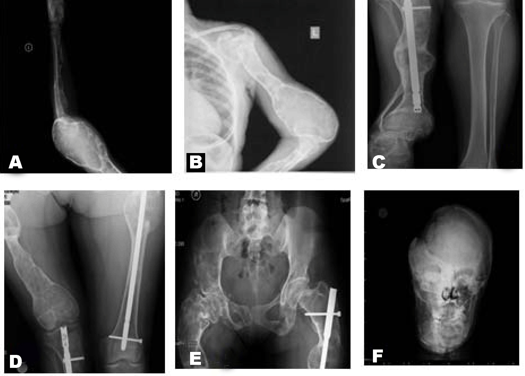 A 21-year-old female was referred to our hospital with the facial deformities. She had pathological fracture of right femur when she was two years old. Histopathological diagnosis was fibrous dysplasia. Recurrent fractures had occured at left arm and left hip (Figure 1A-E). There were intramedullary nails at right tibia and left femur (Figure 1C-E). The deformities of extremities were shown in Figure 1A-E. There was a scene of expansion of distal humerus related to cystic change of bone (Figure 1A-B). In Figure 1C-D, there were severe bowing deformity of long bones, tibia and femur, respecitvely. There was shortening of bones of tibia, fibula and femur. Fibula was hypoplastic (Figure 1C). Lytic lesion at the iliac bone was seen in Figure 1E. There were deformities of mandible and other craniofacial region. Heterogenous sclerotic changes of the calvarial bones related to fibrous dysplasia was occured in Figure 1F. There was no aeration in right maxillary and frontal sinuses. There was predominant expansion and sclerotic changes of right orbita (Figure 1F). She had underwent operations beacause of the compression of cranial nerves and facial deformity. Besides, pamidronate was administered intravenously (consecutive 3 days, total 180 mg) as medical therapy. The patient had recovered from her symptoms with bisphosphanate treatment. Improvement in bone turnover markers was observed with treatment but there was no change in radiographic appearance. |