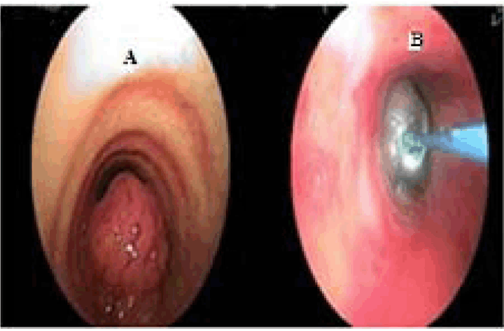 A 45-year-old female, nonsmoker, presented to casualty with tachypnea and tachycardia. She was admitted to the intensive care unit with respiratory acidosis. There was a history of irritant cough with expectoration and breathlessness since 20–25 days. A past history of hyperthyroidism was noted, for which she was on treatment since last six months. After admission, she was diagnosed with diabetes mellitus incidentally. Chest X-ray showed mediastinal widening. Computed tomography (CT) scan suggestive of 2x1.8 cm sized enhancing polypoid lesion arising from the lateral wall of the distal trachea, just proximal to carina, protruding into the lumen, almost obliterating the entire tracheal lumen (Figure 1). Flexible bronchoscopy confirmed the CT findings (Figure 2A). However, the lesion was just negotiable enough to permit visualization of the distal carina, and a preliminary toilet of all accumulated secretions from both left and right endobronchial trees was done. Under conscious sedation, almost near complete fulguration of the tumor was done with using diode laser (GaAIA) after collecting adequate specimen for histopathology (Figure 2B). The luminal obstruction was relieved totally with careful fulguration of the pedicle to avoid intrabronchial hemorrhage. Histopathology reported adenoid cystic carcinoma. Repeat CT virtual bronchoscopy showed residual asymmetric 8 mm thickening and irregularity along the left lateral wall of the trachea, extending over 1.7 cm, approximately 2.1 cm proximal to the carina. A week after optimization, she was taken up for segmental resection of the distal trachea. The approach used was transmediastinal through a median sternotomy. Intraoperative first bronchoscopy was performed to confirm the exact position of residual lesion and length of segment to be resected. Median sternotomy with a collar incision was taken (T-shaped). Trachea was dissected along its entire length anteriorly and posteriorly preserving lateral segmental blood supply, inferiorly up to carina to mobilize the distal trachea to achieve length and tension free resection-anastomosis. Under intraoperative bronchoscopic guidance anterior wall of trachea divided just proximal and distal to lesion (just above carina) and patient ventilated through distal tracheal intubation with a flexometallic endotracheal tube placed through the surgical field. Posterior membranous trachea was divided taking care of esophagus and specimen delivered (Figure 3). After confirming free margins on frozen section, end to end tracheal anastomosis performed using 4.0 PDS, where posterior wall sutures taken continuous; then, from lateral to anterior wall interrupted sutures taken with knots placed outside the tracheal lumen. During this period, oroendotracheal tube is placed distal to anastomosis. No peritracheal leak seen on leak test. Postoperative check bronchoscopy confirmed patency and completeness of suture line. Patient tolerated procedure well, extubated on table and shifted to intensive case unit (ICU) for monitoring. On postoperative day (POD) 1 the patient developed respiratory distress with air bubbling in the mediastinal drain. Check bronchoscopy showed a gape in suture line in posterior wall of trachea along the left lateral aspect over a region of 1–2 stitches. After a multidisciplinary meeting (MDM), it was decided to reintubate the patient to reduce airway pressures and the patient was kept on a T-piece with spontaneous breathing. The bubbling in the drain stopped post-intubation. On POD 3 after a repeat MDM patient extubated. On POD 5 the patient shifted out of ICU with full Ryle's Tube feeds. On POD 7 check bronchoscopy done suggestive of granulation tissue noted over the gaped area. Rest of the suture line was normal. With symptomatic improvement and serial chest X-rays suggestive of reduction in mediastinal widening patient discharged on POD 14. Final histopathology report confirmed adenoid cystic carcinoma of the trachea with negative margins with no lymphovascular emboli or perineural invasion and negative lymph node (Figure 4A-B). Postoperative adjuvant radiotherapy of 56 Gy in 28 fractions for 46 days given to the tumor bed with three-dimensional conformal radiation therapy. She is on six monthly follow-ups with check bronchoscopy and annual CT scan. The patient remains asymptomatic with normal check bronchoscopy (Figure 5) and CT scan at 18th month post-procedure. | ||||||