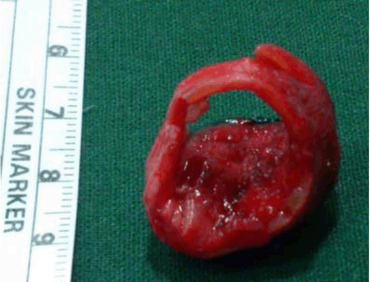 Adenoid cystic carcinoma of the trachea is a rare occurrence. Tracheal tumors as a whole account for 0.2% of all respiratory malignancies and only 10% of these cases are adenoid cystic carcinoma [4]. It often shows indolent behavior with a prolonged slow and insidious progression, often over several years, despite propensity of local recurrence and distant metastasis [5]. Treatment options include surgery alone, radiation therapy alone, or a combination. The surgical operations are primary tracheal resection and reconstruction, primary tumor resection, and endoscopic resection, either by coring or using a laser. Only complete surgical resection provides the best chance of prolonged survival or even complete remission. Adjuvant radiotherapy may have some effect on local control but did not affect survival rate [6]. Inoue et al. reported only tracheal resection in nine patients, resection of the trachea plus carina in four patients, tracheal incision and tumor enucleation in one patient of ACC and 11 of 13 patients with adenoid cystic carcinoma were alive without recurrence at last follow-up, and this ranged from 2–9 years [7]. A less extensive surgical resection may also be possible after preoperative bronchoscopic treatment [8]. Laser photocoagulation [Nd:YAG] offered effective treatment in the majority of patients with obstructing tracheobronchial tumors, with acceptable morbidity even for unresectable or unfit patient [9]. Zdenko Tudjman and Vedran Ostojic study of 1244 patients of which 971 were malignant cases of which 53% resected completely and 40% patients resected incompletely with 6% patients were inoperable and remaining benign lesions. They were managed with Nd:YAG and diode laser, and results confirm that laser therapy is highly effective and safe therapeutic method in carefully selected patients, if performed by well-equipped and skilled team of experts. It has been suggested that the Nd:YAG laser is more effective in cases of larger tumor masses and diode laser is more precise with less risk of hemorrhage, perforation and other complications [10]. In our case with use of diode laser, we were able to relieve the acute tracheal obstruction with no complications in conscious sedation and were able to do tracheal resection electively after optimizing the patient with minimal morbidity. | ||||||