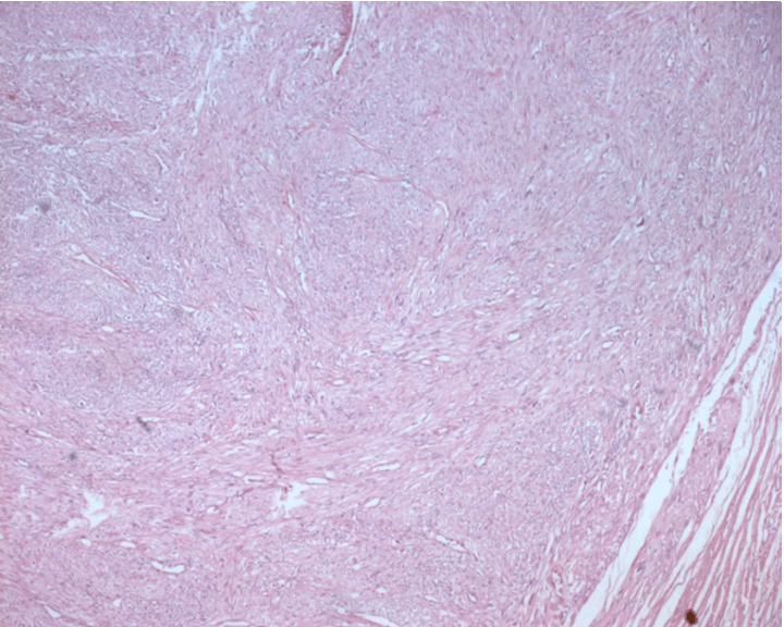 Figure 1: Diffuse mesenchymal proliferation of malignant spindle shaped cells with eosinophilic, fibrillary cytoplasm and atypical nuclei displaying mitotic figures (H&E stain, x100).