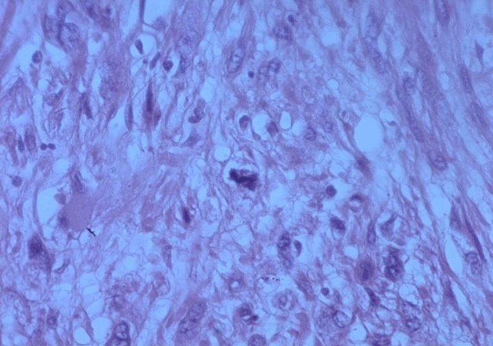 Figure 2: Diffuse mesenchymal proliferation of malignant spindle shaped cells with eosinophilic, fibrillary cytoplasm and atypical nuclei displaying mitotic figures (H&E stain, x400).