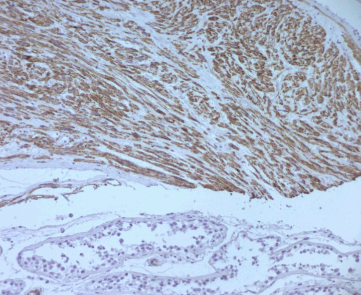 Primary leiomyosarcoma of the testis is an extremely rare tumor. To our knowledge, only less than 20 cases have been reported (Table 1). Smooth muscle elements of the testicular parenchyma, especially blood vessels and the contractile cells of seminiferous tubules, appear to be the origin of intratesticular leiomyosarcoma [1] [18].