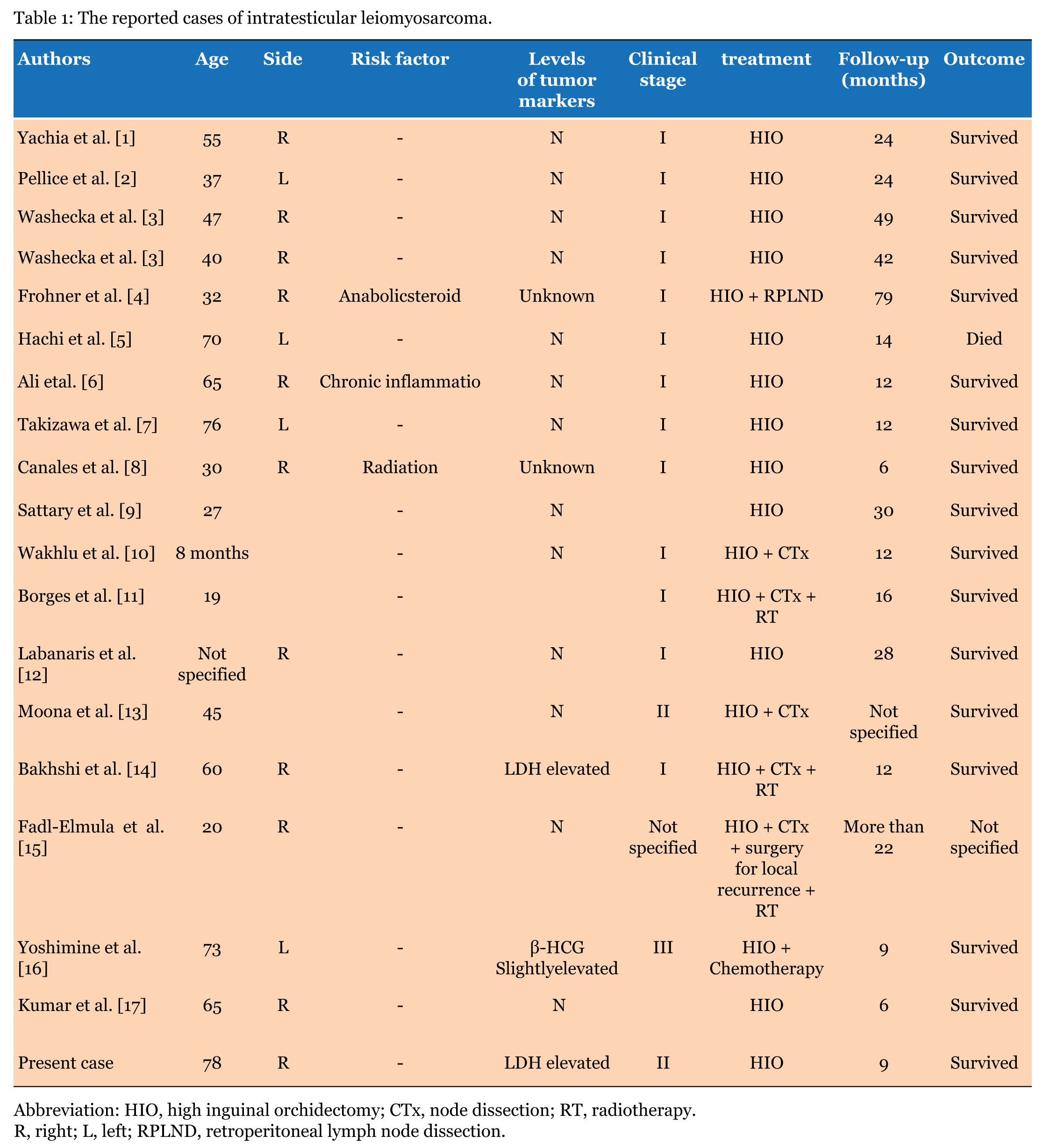 Table 1: The reported cases of intratesticular leiomyosarcoma.