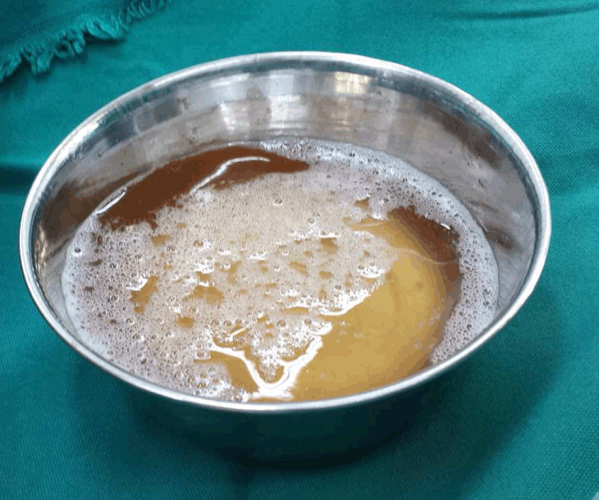 A 65-year-old male with end-stage renal disease for eight months, presented one month after a right basilic vein superficialization (Figure 1) with a swollen upper arm (Figure 2). The swelling started two weeks after the operation and grew gradually over the course of two to three weeks. He did not complain of any pressure symptoms, nor was he experiencing pain distal to the swelling. The arteriovenous fistula fistula was intact. On examination, the swelling was well confined, cystic, non-tender, located on the medial aspect of the right upper arm and was not attached to overlying skin. It measured about 10x20 cm. The patient's radial and ulnar pulses were intact and there were no signs of ischemia. A thrill was felt and a bruit was heard on the brachiobasilic fistula which lied on the superior border of the swelling. On greyscale ultrasonography the swelling represented a hypoechoic region (Figure 3). A Doppler ultrasound was performed, thus confirming the patency of the fistula. In view of the above description, the differential diagnoses we put in mind were hematoma, lymphocele or a seroma. On aspiration of the swelling, the fluid was straw-colored and cytology confirmed features of lymphocele. The patient was planned for weekly sessions of lymphatic fluid aspiration and sclerotherapy. This continued for four consecutive weeks. On the first session, a total of 130 mL of straw-colored fluid was drained (Figure 4), 7 cm3 of diluted povidone iodine were injected and mild pressure was applied with a bandage. On the subsequent sessions, the same amount of fluid was aspirated, indicating inadequacy of the procedure, and povidone iodine was used as the sclerotherapeutic agent. On the fifth session, following aspiration and sclerotherapy, a gauze was fixed externally between two skin folds using two simple interrupted sutures to apply high pressure on the cavity and was left in place for five days (Figure 5). After removal of the gauze, the lymphocele has resolved completely (Figure 6) and on serial follow-up sessions there was no recurrence and the arteriovenous fistula fistula was functioning well. | ||||||