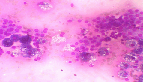 A 37-year-old female presented with complaints of thyroid swelling for the last three months which was associated with tachycardia and positive Stellwag's sign with no previous history of thyrotoxicosis. Thyroid function tests revealed normal levels of T3 (2 nmol/L) and T4 (14.8 nmol/L) but decreased levels of TSH (0.011 mU/L) hence diagnosis of thyrotoxicosis was made. Ultrasound of the neck revealed multinodular goitre. Fine-needle aspiration cytology (FNAC) was suggestive of colloid goitre (Figure 1). The patient was started on antithyroid drugs and beta blockers. Euthyroid state was achieved in four weeks. Patient underwent near total thyroidectomy. Within 24 hours following surgery patient developed features of hypocalcemia. She had multiple episodes of carpopedal spasms over a period of next 40 days which were managed by I.V. injection calcium gluconate, and oral calcium and vitamin D3. She was gradually weaned off the injection, and only oral calcium and vitamin D3 supplementation were continued. Histopathology was suggestive of Hashimoto's thyroiditis (Figure 2). The antithyroid antibody levels were estimated following surgery. Antimicrosomal and antithyroglobulin levels were high. The patient was started on thyroxine 50 mg supplementation and oral vitamin D supplementation was continued. Thyroid function tests and serum calcium levels were within normal limits at six months following surgery, hence oral calcium was stopped. Thyroxine 50 mg had been continued. There has been no episodes of hypocalcemic attacks during ensuing three months following stoppage of oral calcium supplementation and serum calcium levels have remained within normal limits. | ||||||