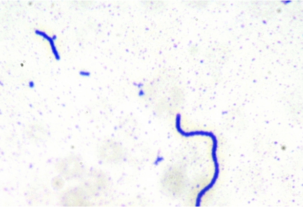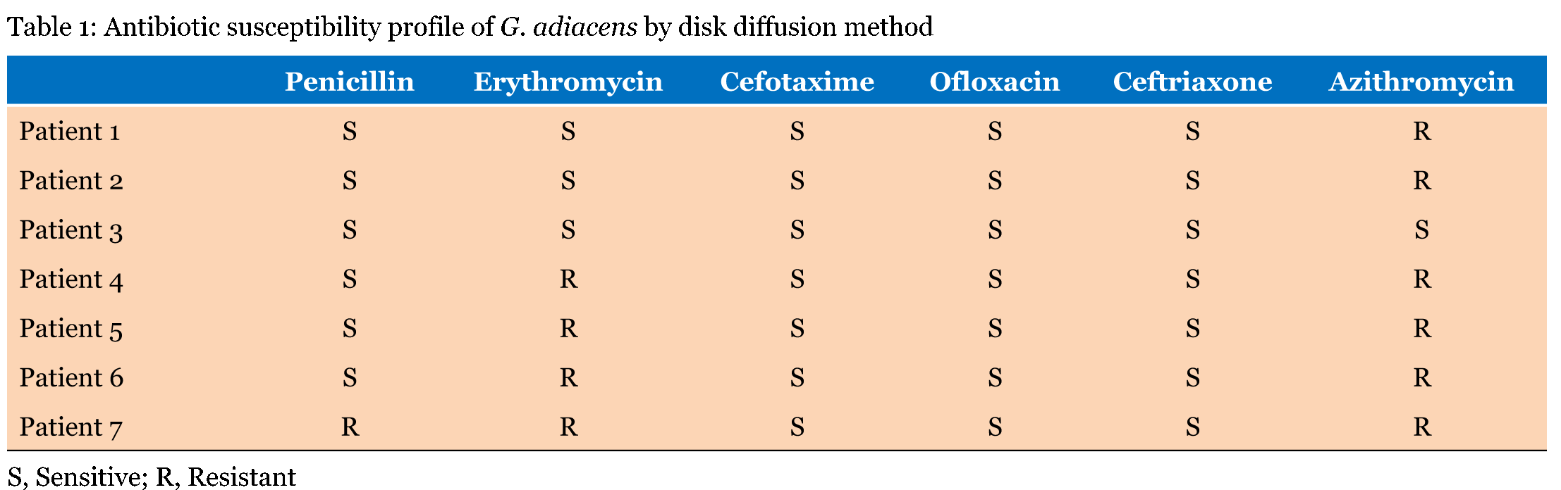 Microbiology records of sterile body fluid cultures done on automated blood culture systems-BACTEC 9240 (BD, Gurgaon, India) and BacT/ALERT (Biomerieux, New Delhi, India) from July 2011 to June 2012 were reviewed to look for isolation of Granulicatella. Laboratory work-up included subjecting centrifuged deposit from an aliquot from the bottle which flagged positive to gram stain to reveal gram-positive cocci in chains (Figure 1), then sub-cultured on 5% sheep blood agar (SBA) incubated in CO2 incubator and MacConkey agar in ambient air. After 48 hours of incubation, small colonies of alpha hemolytic streptococci were seen on SBA (Figure 2). The results of biochemical test done for preliminary identification were-catalase negative, oxidase negative, bile aesculin negative, no growth in 6.5% NaCl, optochin resistant, vancomycin sensitive and bile solubility test were negative [6]. Two of the strains were positive for satellitism around Staphylococcus aureus . Identification was by VITEK Compact 2 (Biomerieux clinical diagnostics, France, headquarters: New Delhi, India) with 99% probability. Pyrrolidonyl arylamidase (PYR), leucine amino peptidase (LAP) and β-glucosidase were positive and both a and β galactosidase tests were negative. The strains were not sequenced. For susceptibility testing of these isolates, Mueller-Hinton agar supplemented with 5% sheep blood was used for convenience and CLSI guidelines for Streptococcus spp. Viridans group were used for interpretation [7]. Patient 1: A one-year-old premature baby with duodenal atresia and pelvic pseudocyst was admitted with posthemorrhagic hydrocephalus with ventriculoperitoneal shunt. Shunt infection was suspected and cerebrospinal fluid sent for culture. G. adiacens, sensitive to penicillin, erythromycin, cefotaxime, ofloxacin, and resistant to azithromycin (Table 1) was grown in culture and the child was started on vancomycin for one week and rifampicin (one/sixth of 300 mg) for two weeks. Clinical condition improved and shunt was removed later. Patient 2: A two-year-old girl with nephrotic syndrome on steroids, was admitted with spiking temperatures. Two consecutive blood cultures isolated G. adiacens, sensitive to penicillin, erythromycin, cefotaxime, ofloxacin, and resistant to azithromycin. Bacteremia was confirmed and the patient was started on ceftriaxone for 10 days and repeat culture was sterile. Patient 3: A two-month-old dysmorphic male neonate with global developmental delay, a case of DPT vaccine induced encephalopathy, aspiration pneumonia, failure to thrive, presented with fever of seven days duration. Blood culture set grew pan sensitive G. adiacens, Piperacillin-tazobactam was started and on request, child was discharged against medical advice. Patient 4: A one-year-old female child was admitted with convulsions and fever. Seizure workup was not contributory and a diagnosis of simple febrile seizures was made. While on antiepileptic, blood cultures grew erythromycin and azithromycin resistant G. adiacens, she was treated with cefixime for seven days and improved. Patient 5: A 58-year-old male, a known case of chronic renal failure and multiple myeloma (on thalidomide) with joint effusion and leucopenia was admitted for pyrexia of unknown origin. Two out of six blood cultures received grew G. adiacens, erythromycin and azithromycin resistant. With the characteristic mitral valve vegetation on echo, a diagnosis of infective endocarditis was made. He was treated with IV penicillin for forty days and gentamicin for two weeks. Repeat blood cultures on follow-up were negative. Patient 6: A 43-year-old male presented with severe joint pains and fever. He was a known case of type 2 diabetes mellitus, hypertension and dyslipidemia. Dengue serology (IgM) was positive. Blood cultures grew G. adiacens, which was erythromycin and azithromycin resistant. The patient was started on ceftriaxone for seven days with platelet transfusion after which he improved. Repeat blood cultures were negative. Patient 7: A one-year-old boy with nephrotic syndrome (on steroids), presented with high-grade fever and wheeze from three days. Two blood cultures grew G. adiacens, resistant to penicillin, erythromycin and azithromycin resistant. A diagnosis of lower respiratory tract infection was made, was treated with cefotaxime for seven days and the boy improved. | ||||||