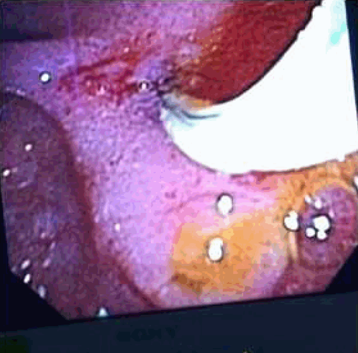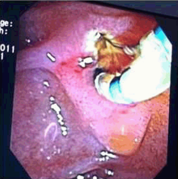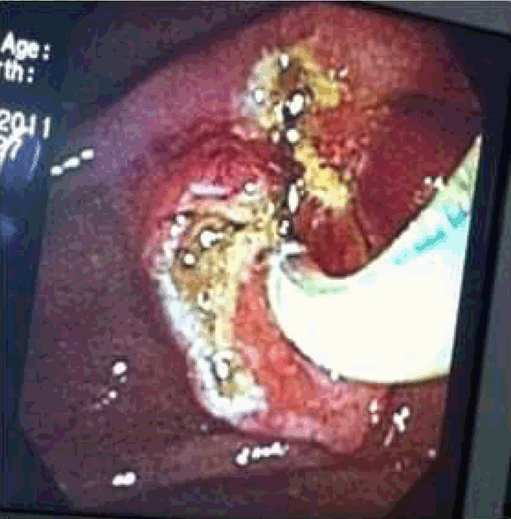 A 43-year-old female presented with severe right upper quadrant abdominal pain, nausea, vomiting and diarrhea for four days. Three years ago, she was admitted for cholecystitis, cholelithiasis and cholangitis requiring an endoscopic retrograde cholangiopancreatography (ERCP) with plastic stent placement for drainage. Unfortunately, the patient was lost to follow-up after initial plastic stent placement. On admission, she was afebrile and her liver function tests were normal. The ERCP was performed which revealed the distal end of the biliary stent, perforating proximal to the periampullary area causing a large choledochoduodenal fistula (Figure 1). The guidewire was successfully negotiated through the native papilla as well as the fistulous tract. No obstruction, mass or stone was noted. A sphincterotomy was done through the fistula (Figure 2) and through the actual sphincter at the ampulla (Figure 3). The sump was opened, swept clean with removal of abundant debris. Her abdominal pain completely resolved and patient clinically improved within 24 hours after the procedure. | ||||||