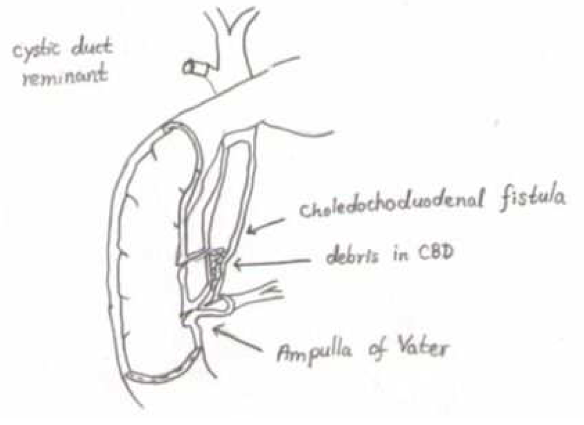 As long as the sphincter of Oddi functions normally, bile and enteric contents will not accumulate in the distal common bile duct (CBD). Biliary sump syndrome occurs when accumulation of debris, stones and static bile acts as a nidus for bacterial proliferation, predisposing the patient to cholangitis. Biliary sump syndrome is a rare complication of biliary enteric anastomosis after cholecystectomy [1]. After side to side choledochoduodenostomy, the CBD between the anastomosis and the ampulla of Vater becomes a potential sump (a recess or reservoir serving a drain for liquids) (Figure 4). In this patient, a choledochoduodenal fistula formed due to the biliary stent migrating to the CBD, perforating proximal to the ampulla. The CBD segment between the fistula and ampulla became a sump. There have been cases reported of spontaneous choledochoduodenal fistulas occurring after biliary metallic stent placement [2]. In those cases the cause may have been inflammation caused by impacted calculi and food material. In this case, there is no stone or masse noted. | ||||||