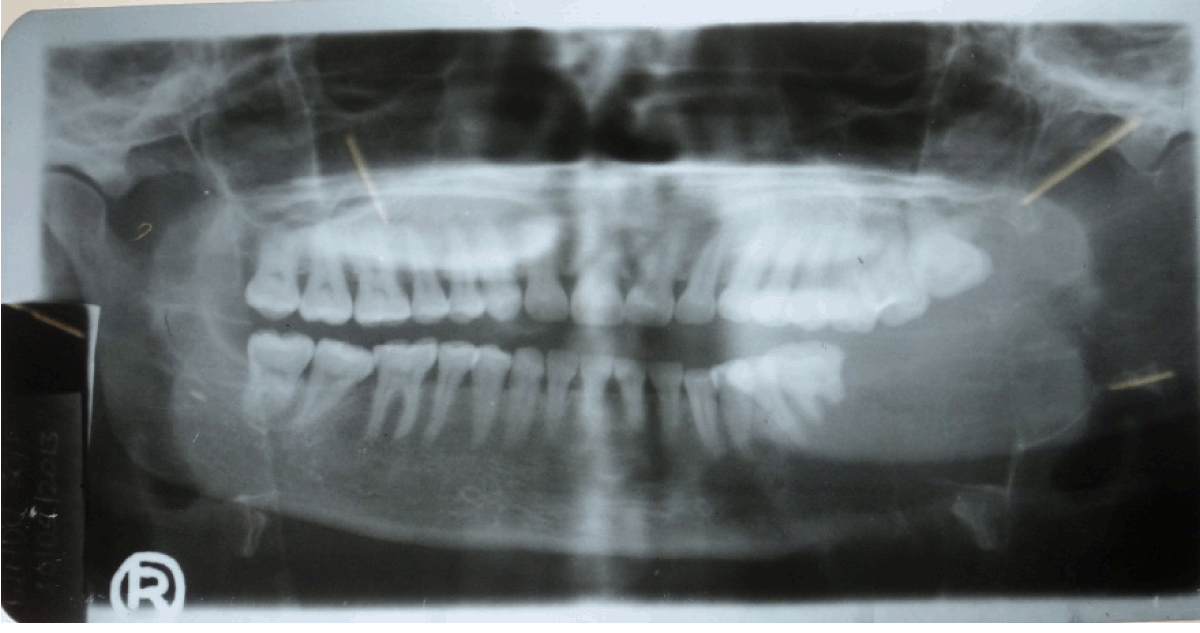 Ameloblastic carcinoma is an extremely rare, aggressive, malignant neoplasm of the jaws with a poor prognosis. It belongs to the family of malignant epithelial odontogenic tumors [1]. It combines the histological features of ameloblastoma with features of cytological atypia regardless of whether it has metastasized [2] [3]. In contrast to ameloblastoma, ameloblastic carcinoma exhibits more aggressive clinical behavior, such as rapid growth, perforation of the cortex and painful swelling [3] [4]. It may metastasize to the regional lymph nodes or lung [3]. In rare cases, brain or multiple bone metastases have been reported [3]. Ameloblastic carcinoma occurs in a wide age range of 15–84 years, but the mean age is approximately 30 years [5] [6]. There is no apparent sex predilection [5]. The most commonly involved area is the posterior portion of the mandible [5] [6]. Majority of the cases of ameloblastic carcinoma appear to arise de novo, and are termed primary ameloblastic carcinoma. Secondary ameloblastic carcinoma is defined as a tumor with malignant transformation within a pre-existing benign ameloblastoma, regardless of the presence of metastasis [4]. Secondary ameloblastic carcinoma is extremely rare. We report a case of secondary ameloblastic carcinoma of mandible in a 30-year-old Indian female. | ||||||