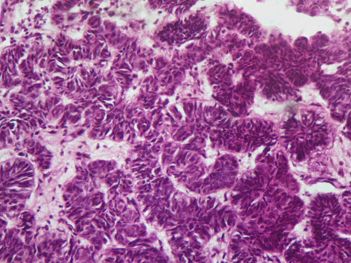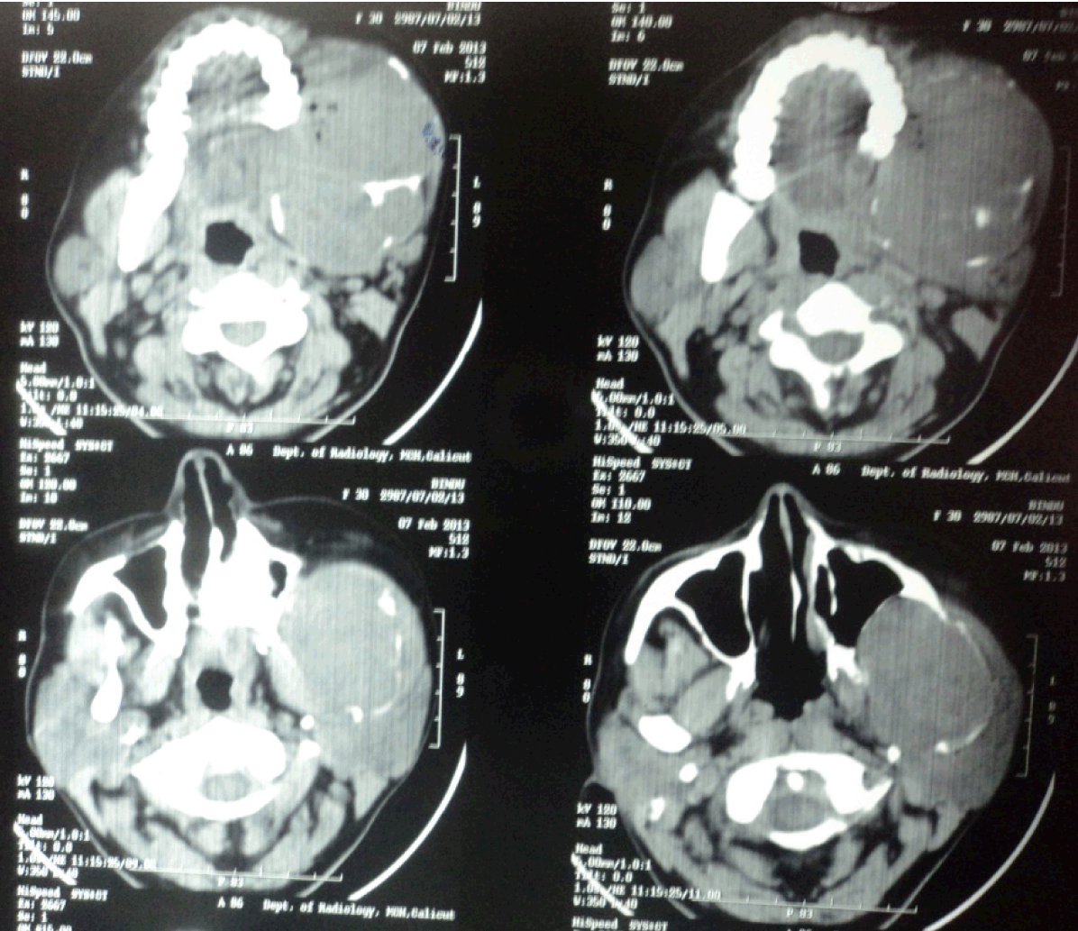 A 30-year-old female presented to our department with a chief complaint of swelling on the left side of the face for the last one year (Figure 1). The swelling was associated with mild pain and the patient had difficulty in mastication and mouth opening. The patient gave a history of mild swelling, pain and mobility of teeth in left lower back region four years ago and she reported to the same centre. Her mandibular left 2nd and 3rd molars were extracted and an incisional biopsy was carried out. The biopsy report was suggestive of ameloblastoma and surgical excision of the lesion was advised. But the patient was not willing for the same and she did not report for the review. She noticed an increase in size of swelling and reported to our department after three years. Clinical examination revealed a diffuse swelling over the left body-ramus region of the mandible, which extended antero-posteriorly from the left corner of mouth to the pre-auricular region. Superiorly, the extent was up to the infra-orbital region and inferiorly to the submandibular region. The overlying skin was normal in color and texture. On palpation, the swelling was mildly tender, smooth, and uniformly bony hard in consistency, with no local rise in temperature. The margins were ill defined. No paresthesia was associated with the swelling and no palpable regional lymph nodes noticed. Mouth opening was 32 mm and no deviation of mandible noted. Intra-oral examination revealed a diffuse swelling of the left lower buccal vestibule extending from the canine region to the retromolar area. Posterior extension was not visualized clinically. A discontinuity of the overlying mucosa was noted with irregular rolled margins posteriorly (Figure 2). On intra-oral palpation, the swelling was firm to hard in consistency and mildly tender. The orthopantomograph (OPG) showed a well-defined radiolucency involving the left body, angle and ramus of the mandible (Figure 3). The OPG revealed root resorption of left lower first molar tooth. Plain and contrast axial and coronal computed tomography (CT) scans showed a lobulated expansile lytic lesion involving body, ramus, and coronoid process of mandible measuring 6.3x8.3x10 cm in size, with thinning of the cortices (Figure 4). A chest radiograph ruled out the presence of any metastatic deposits. An incisional biopsy was done and the tissue was sent for histopathologic examination. The histopathology was consistent of ameloblastic carcinoma (Figure 5). On the basis of the histopathology report, left hemimandibulectomy was done taking a safe margin of 2 cm and the defect was reconstructed using Titanium reconstruction plate. Chemotherapy and radiotherapy was not advised. The patient is under regular follow-up. No recurrence or metastases reported during the follow-up period. | ||||||