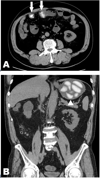 Small bowel obstruction (SBO) is a common disease encountered in daily practice. The causes of SBO can vary. In the review of unusual causes of SBOs, 60% of them are caused by adhesions, followed by hernias 15%, neoplasms 6%, inflammatory causes 5%, mesenteric vascular occlusion 5%, intussusception 3%, and unusual etiology 6%. [1]. Matsuzaki et.al. reviewed 193 patients of SBOs induced by food in Japan [2]. The most frequent causative food is seeds or stones fruit, followed by rice cakes, seaweed, agar or gelatin food made from devil's tongue starch. The patients are often associated with previous abdominal surgery, especially gastrectomy. Dental disorders such as problems with chewing or artificial teeth, unusual eating habits like swallowing without chewing, and irradiation to abdominal cavity can also be contributing factors. Rice cakes are often eaten in Japan. Especially in the New Year's Holidays, because Japanese people have a tradition to eat rice cakes in those holidays. Miura et al. reviewed 14 patients of SBO caused by rice cake [3]. Ten out of fourteen patients have a history of previous abdominal surgery and all patients had ingested rice cake by swallowing without chewing. In this patient, interestingly, he had no contributing factors like previous abdominal surgery or unusual eating habits. The diagnosis of SBO induced by food is generally difficult. However, the diagnosis of SBO due to rice cake can easily be obtained by CT scan. The rice cakes are typically visualized as high density materials in the alimentary tract [3]. Treatment of rice cake induced SBO should be non-operative management, with occasional decompression by a nasogastric tube and fluid supply. All patients can be successfully treated by non-operative management in the recent review, as in the present patient [3]. However, chronic symptom could possibly cause ulcer or intestinal perforation so careful following-up should be considered. |