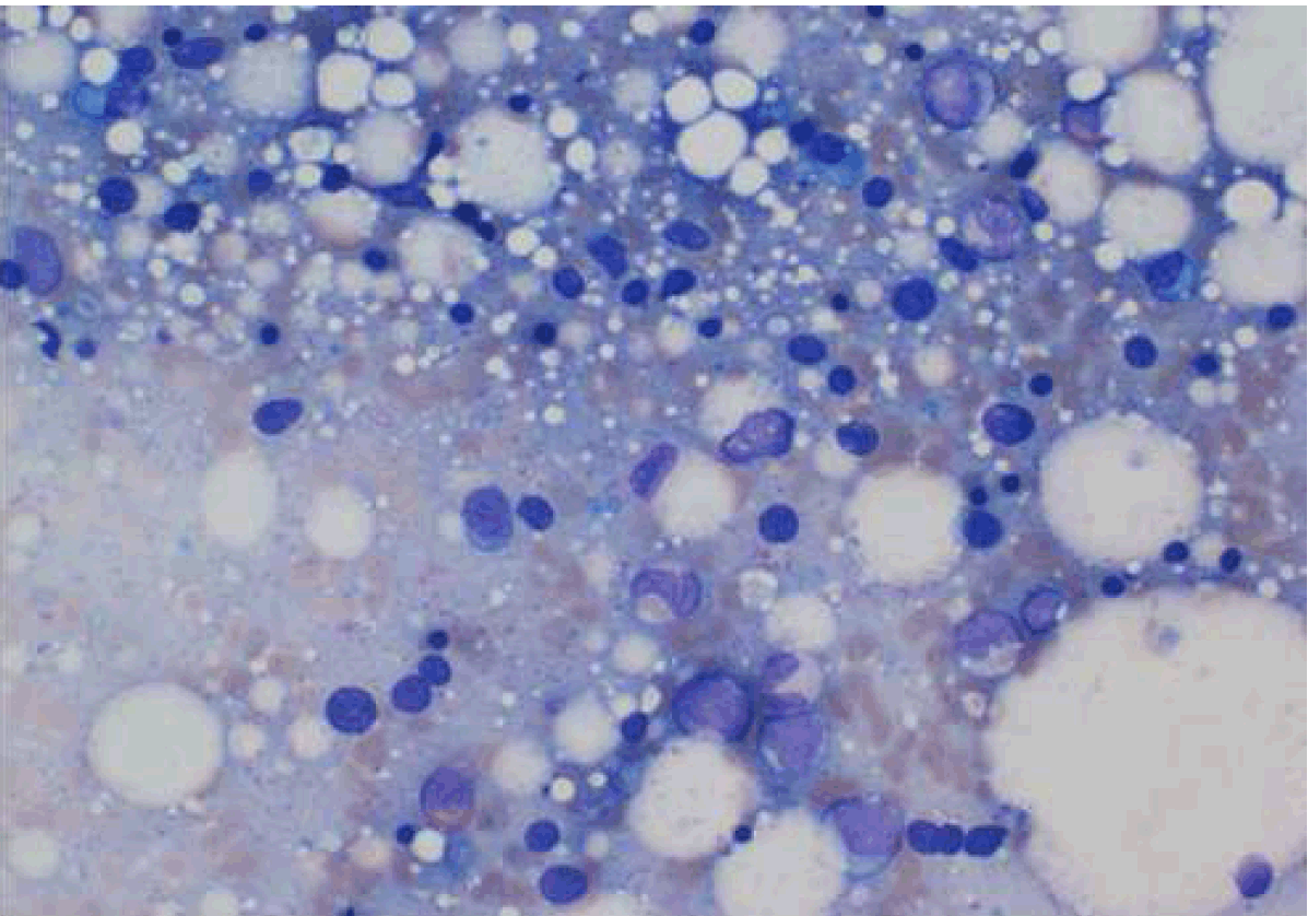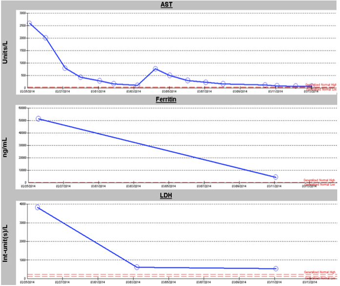 A 48-year-old African-American male presented with altered mental status and one week of fever, confusion and visual-tactile hallucinations. He reported malaise and subjective fever since one month. He had lost 40 pounds over the last two years which prompted a diagnosis of HIV/AIDS, made two months prior to his recent presentation. At that time his viral load was 630,000 copies/mL and CD4 count was 24/mm3. He had not yet initiated antiretroviral therapy and was on bactrim prophylaxis for Pneumocystis pneumonia. His only other medication was hydrochlorothiazide for hypertension, which was well controlled. He reported being sexually active with men. Physical examination was significant for fever of 103°F and a regular tachycardia. He was alert to person, place and location but deferred other questions to his mother due to confusion. There were no focal neurological findings. His initial laboratory workup showed pancytopenia (WBC 2.5x103/µL, HCT 21, platelets 145x103/µL) with markedly elevated serum ferritin (51,376 ng/mL, normal: 23–336 ng/mL) levels along with raised serum transaminases (ALT-450 IU/L, normal:15–58 IU/L; AST-790 IU/L, normal:14–40 IU/L) and normal alkaline phosphatase-109 IU/L (normal: 39–117). Routine cerebrospinal fluid (CSF) analysis, neuroimaging and chest X-ray were within normal limits. An initial differential diagnosis included, disseminated histoplasmosis, hemophagocytic lymphohistiocytosis (HLH) due to HIV, leptospirosis, fulminant viral hepatitis from herpes simplex virus (HSV) or hepatitis B and disseminated Mycobacteriosis. Given the acuity of his presentation he was given an initial empirical coverage with vancomycin, piperacillin and tazobactam, acyclovir and amphotericin B for suspected sepsis and hepatitis. However, there was little improvement in his clinical status the following day with worsening pancytopenia (WBC, HCT and platelets are 1.9 x103/µL, 25 and 90x103/µL respectively) and liver function (ALT and AST rose to 1500 and 2000 IU/L, respectively with an INR at 2.2 (normal: 1). Additionally, he developed renal failure (serum creatinine 1.7 mg/dL, normal: 0.5–1.2 mg/dL). A comprehensive infectious workup including a viral hepatitis panel and others (CSF culture and cytology, CSF-AFB, HSV PCR and IgM, CMV antigen, HHV-6 DNA, adenovirus DNA, parvovirus PCR, VDRL, leptospirosis antibody, Bartonella IgG and IgM, AFB blood isolators, cryptococcal antigen, urine histoplasma antigen, blood and urine cultures, stool giardia and cryptosporidium tests) were checked and found to be negative. A bone marrow biopsy was subsequently performed to look for any evidence of an opportunistic infection or hemophagocytosis. The results were indicative of HIV/AIDS related changes including plasmacytosis, megaloblastic change, megakaryocyte hyperplasia, reticulin fibrosis, stromal damage, histiocyte hyperplasia, and hypercellularity (Figure 1). In the absence of an infectious etiology, a diagnosis of HLH was made using the 2009 criteria (Table 1) and the patient was started on HAART (raltegravir, emtricitabine and tenofovir). He improved dramatically within three days of initiating HAART. His agitation resolved along with improvement in his fever and liver function tests. He was discharged two weeks after starting HAART. He is being followed in the clinic and is doing well, eight months later. Below is a figure demonstrating his laboratory trends after HAART initiation (Figure 2). | ||||||