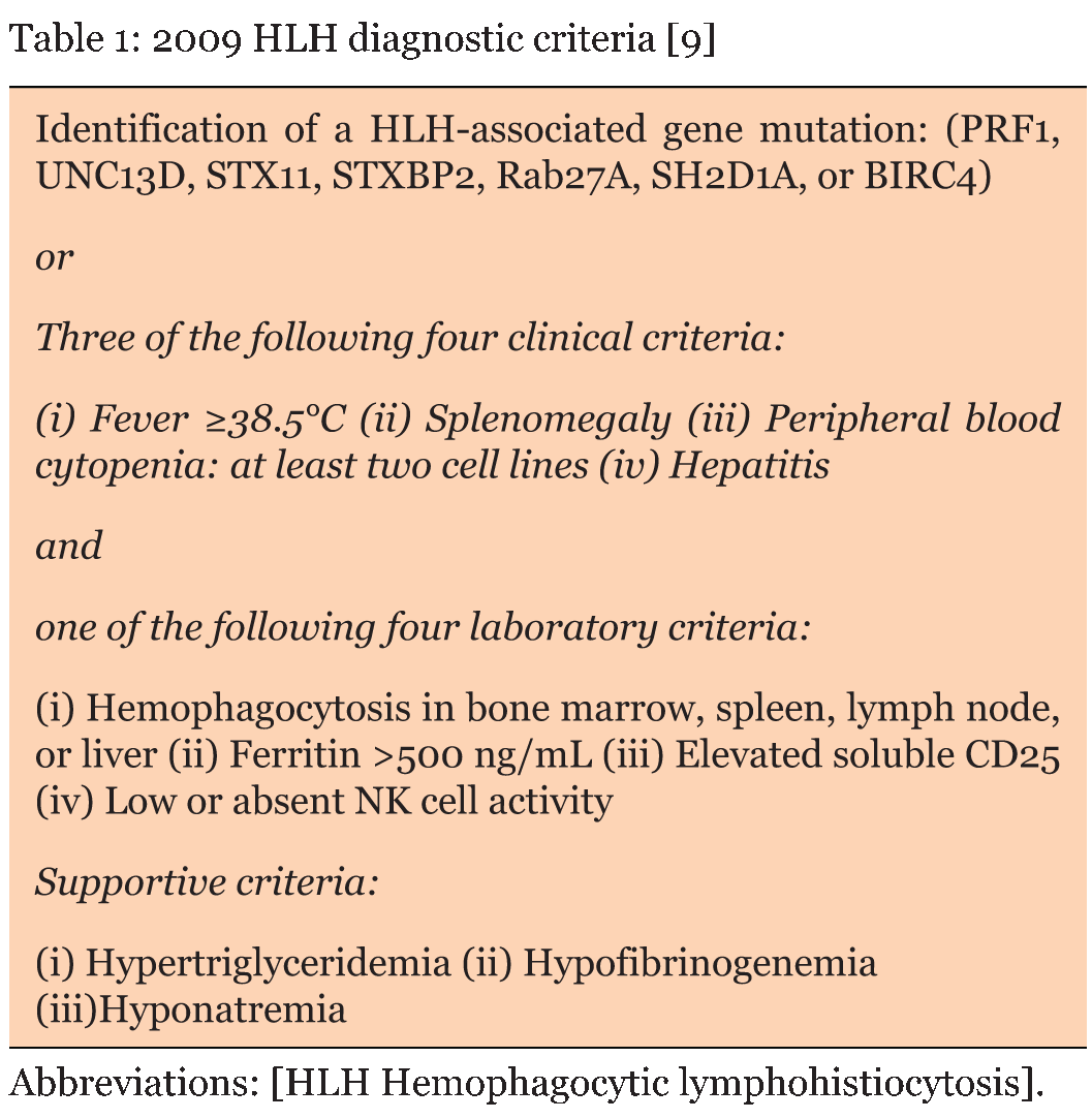 Our case highlights chronic HIV alone as a trigger for hemophagocytic lymphohistiocytosis (HLH). It stresses the use of more liberal diagnostic criteria as proposed in 2009. It further underscores the importance of an early treatment initiation with highly active antiretroviral therapy (HAART) in the HIV associated HLH cases, as it may potentially prevent the use of immuno-modulatory agents, in this immune-deficient population and provide complete recovery even in severe cases. | ||||||