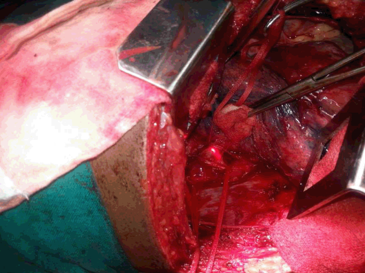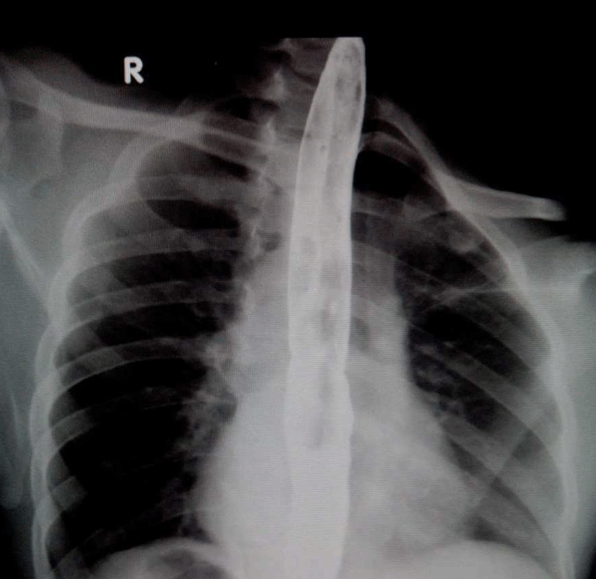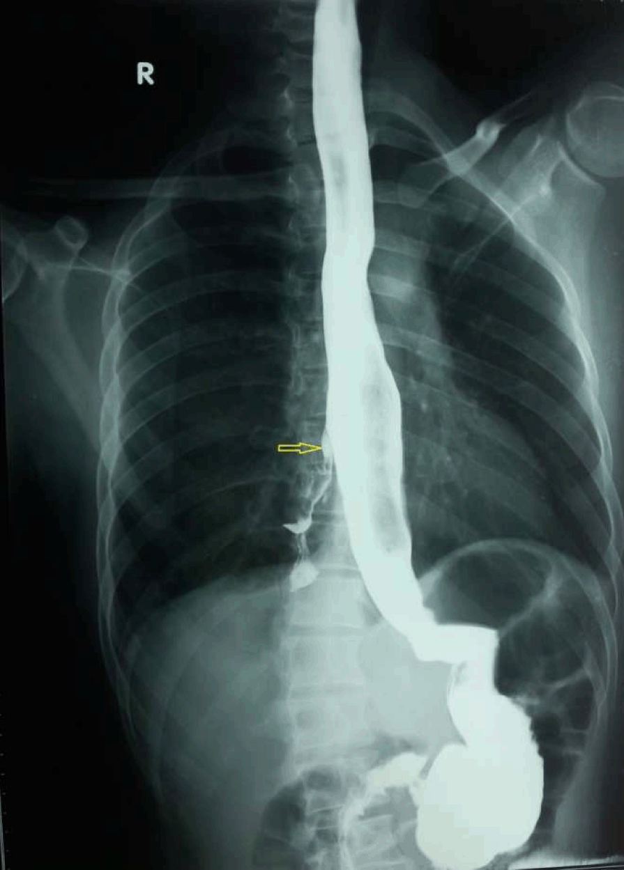 A 37-year-old male presented to our department with history of cough with expectoration immediately after taking food, especially liquids for last 13 years. He had two bouts of hemoptysis in the last 15 days which had made him seek medical attention. Clinically, chest on auscultation had crackles in right infra-scapular region. Chest X-ray revealed patchy opacities in the right lower zone paracardiac region. Computed tomography (CT) scan of thorax revealed consolidation in posterior segment of the right lower lobe with no evidence of lung sequestration or cyst. Upper gastrointestinal endoscopy showed a fistulous opening in the mid esophagus 32 cm from the incisor teeth. It did not show any evidence of malignancy, granulomatous disease or any other acquired basis for the fistula. Simultaneously, methylene blue was injected into the fistulous tract and bronchoscopy was done which was normal. Barium swallow showed fistulous communication between mid esophagus and right lower lobe bronchus at lower border of T7 with barium passing downward into the right lung (Figure 1). Preoperative evaluation done included pulmonary function tests, echocardiogram and electrocardiogram. Incentive spirometry was started for better postoperative outcome. Preoperatively, 1 fr size guide wire was introduced endoscopically into the fistulous tract to aid identification of fistula. Patient underwent right posterolateral thoracotomy. There were minimal adhesions around the fistulous site which was identified about 5 cm below the level of entry of azygos vein into superior vena cava. Azygos vein was isolated, ligated and cut to aid esophagus to be encircled, to localize the fistulous tract. As the guide wire was not palpable through the tract, intraoperative endoscopy was done and fistula tract location was confirmed. The fistulous tract was dissected, it was 10 mm long. The tract was excised, both the esophageal and bronchial ends were healthy and were closed with 4–0 Vicryl. An intraoperative leak test was done using endoscopy which confirmed the integrity of the repair and an intercostal drain placed (Figure 2) (Figure 3) (Figure 4). Postoperative period was uneventful. Intercostal drain was removed on postoperative day-4 after a barium swallow to confirm that there was no leak and patient was discharged on postoperative day-6, after starting oral soft diet (Figure 5). Histopathology showed the mucosa to be lined by stratified squamous epithelium. There was no evidence of inflammation, granuloma or carcinoma confirming the congenital nature of the fistula. Patient is totally asymptomatic after 12 weeks of surgery. | ||||||