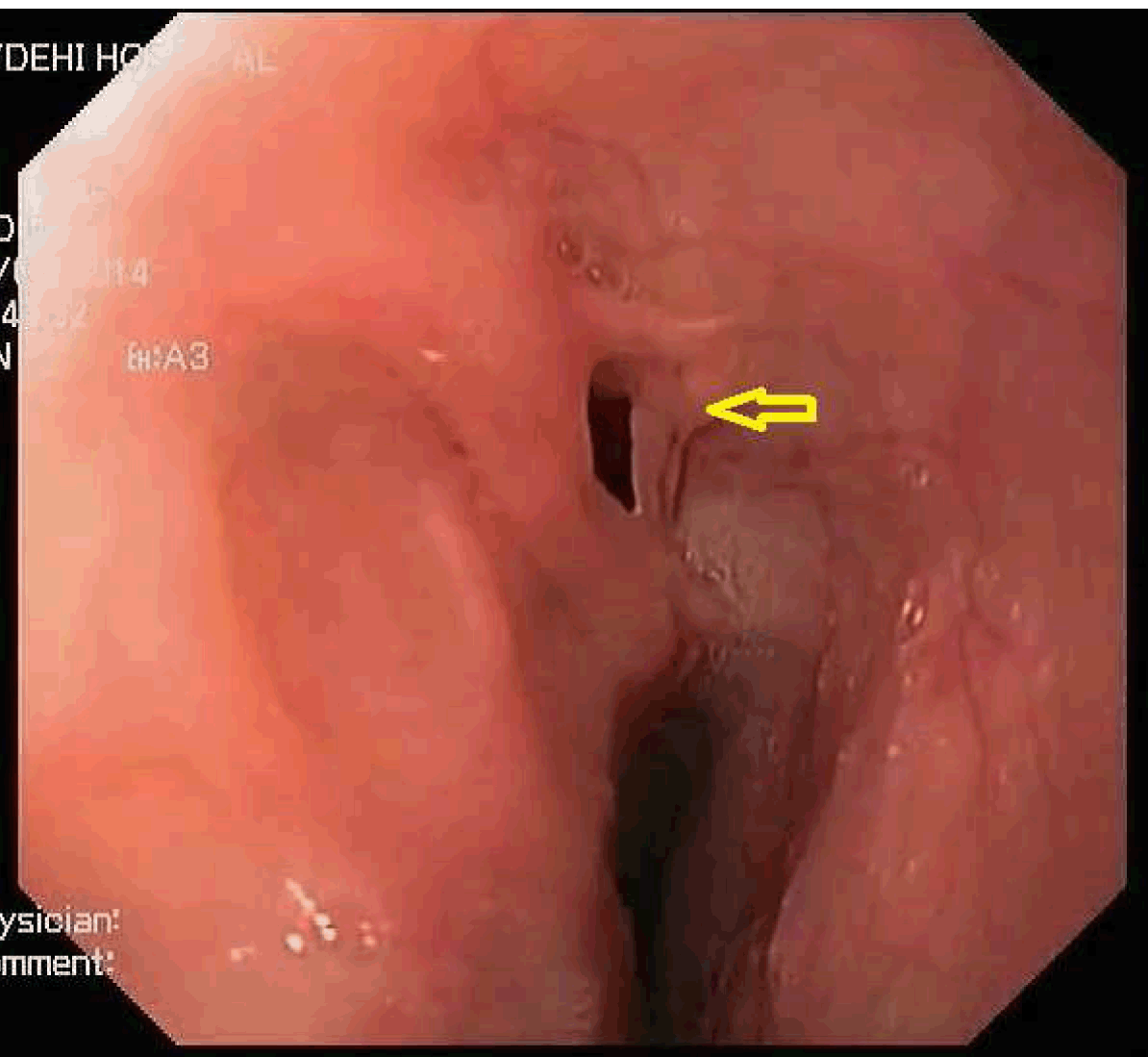 Fistula between esophagus and bronchus may be congenital or acquired. Acquired fistulas can be inflammatory, traumatic or neoplastic. Congenital esophago bronchial fistula (EBF) with atresia present immediately in infancy, are sudden and are diagnosed early and treated [1]. Congenital EBF without atresia are insidious, can present in adulthood also or missed often especially if they communicate with a lobar bronchus [1]. To differentiate between congenital and acquired EBF in an adult is usually difficult [2]. Adult EBF may present acutely with sudden respiratory distress, chronically with repeated respiratory infections or can be totally asymptomatic. Less than 200 cases of adult EBF are reported so far in literature [2]. Herein, we report a rare case of 37-year-old male with congenital EBF without atresia (type 2 according to Braimbridge's classification) [1] which was diagnosed by barium esophagogram. Patient underwent transthoracic fistulectomy with the repair of both esophageal and bronchial ends. Postoperative outcome was successful with complete resolution of symptoms and closure of fistula. | ||||||