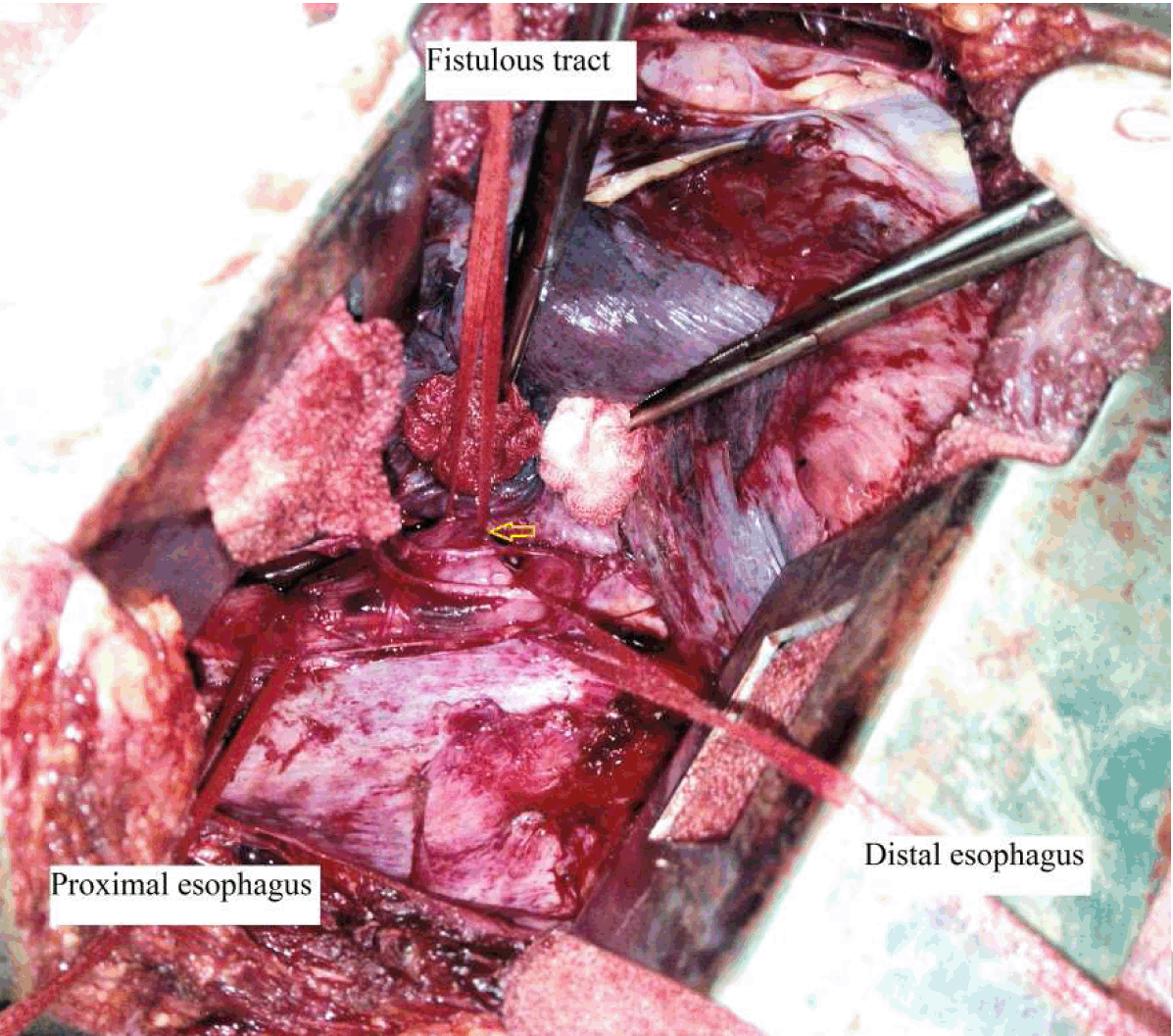 Barium swallow, Congenital esophagobronchial fistula, Peroperative endoscopy, Transthoracic excision