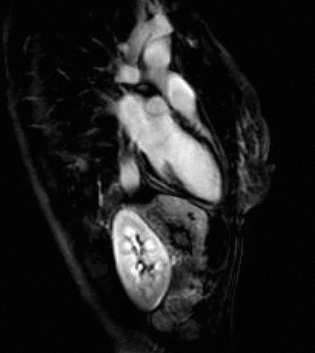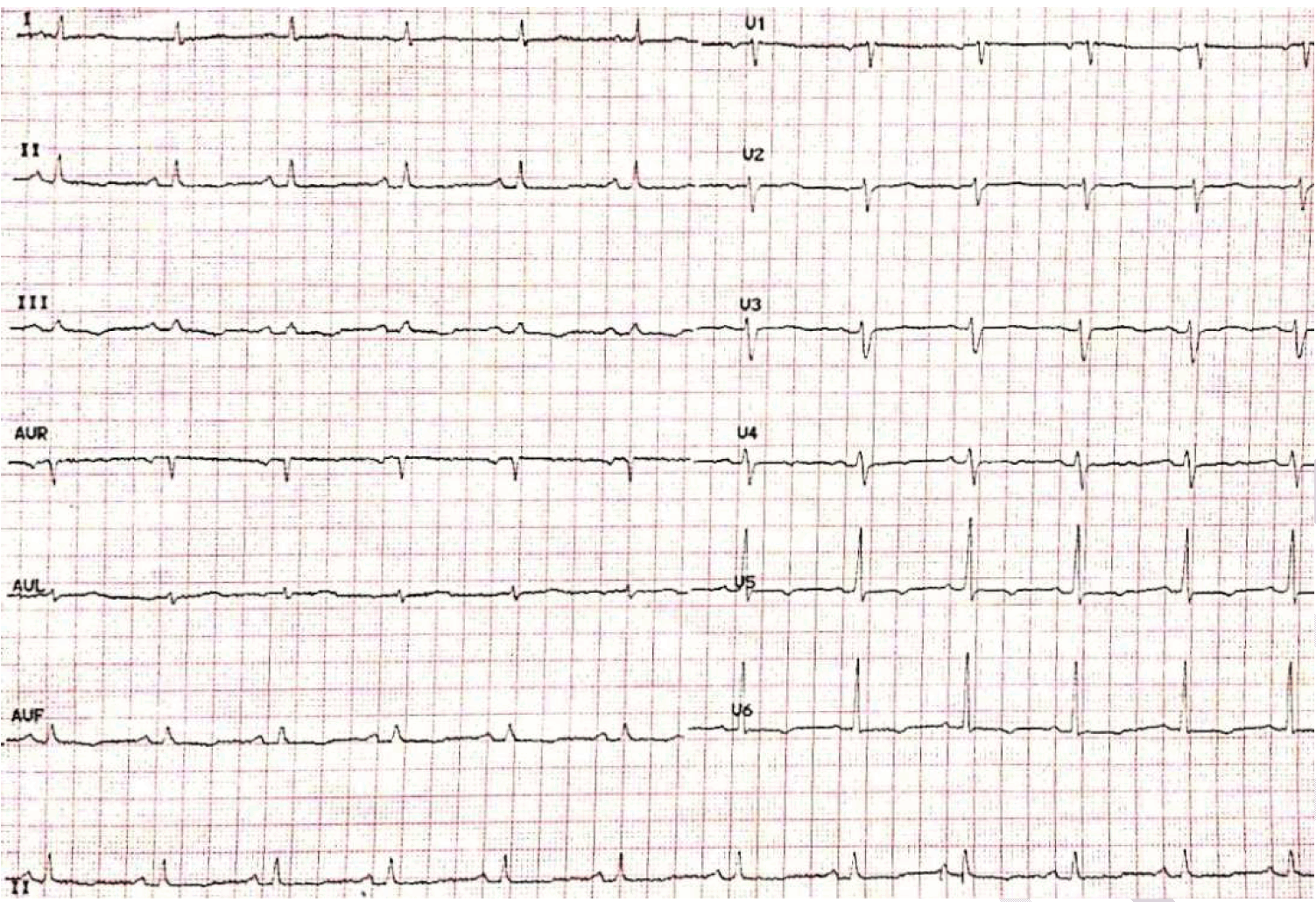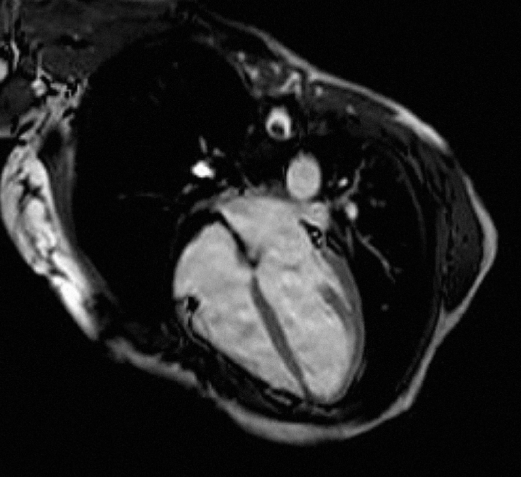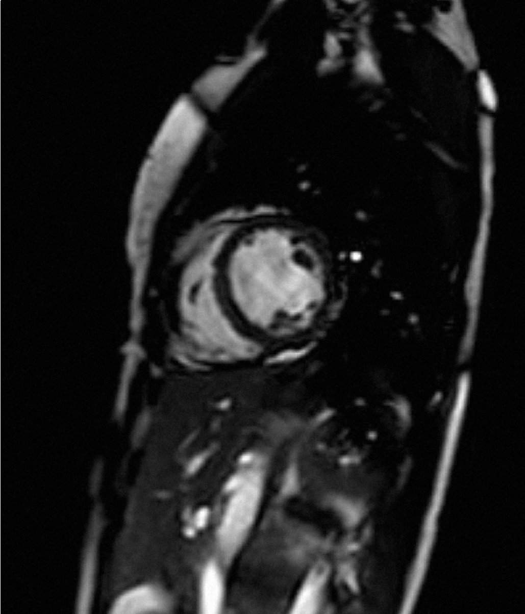 A 51-year-old Caucasian female with a past medical history of depression underwent dental procedure. She had no allergy, no history of smoking or alcohol consumption, and no family history of heart disease. The dentist injected a solution of 2% xylocaine into gum. Three minutes following the procedure, the patient complained for chest pain, during one hour. She was admitted to a cardiac intensive care unit. Her blood pressure was 125/65 mmHg, her pulse rate was 70 beats per minute (regular), and her spontaneous arterial oxygen saturation was 97%. Her physical examination was normal. Her electrocardiogram (ECG) revealed T waves inversions in AVF, DII, DIII, V4, V5 and V6 (Figure 1). Troponin level performed at admission was 23 ng/mL (N=0,05). C-reactive protein (CRP) concentration was normal. Chest X-ray was normal. Cardiac catheterization and ventriculography were normal. An early trans-thoracic echocardiogram and cardiac MRI found a global left ventricular hypokinesis with depressed ejection fraction of 40%, without late gadolinium enhancement (Figure 2)