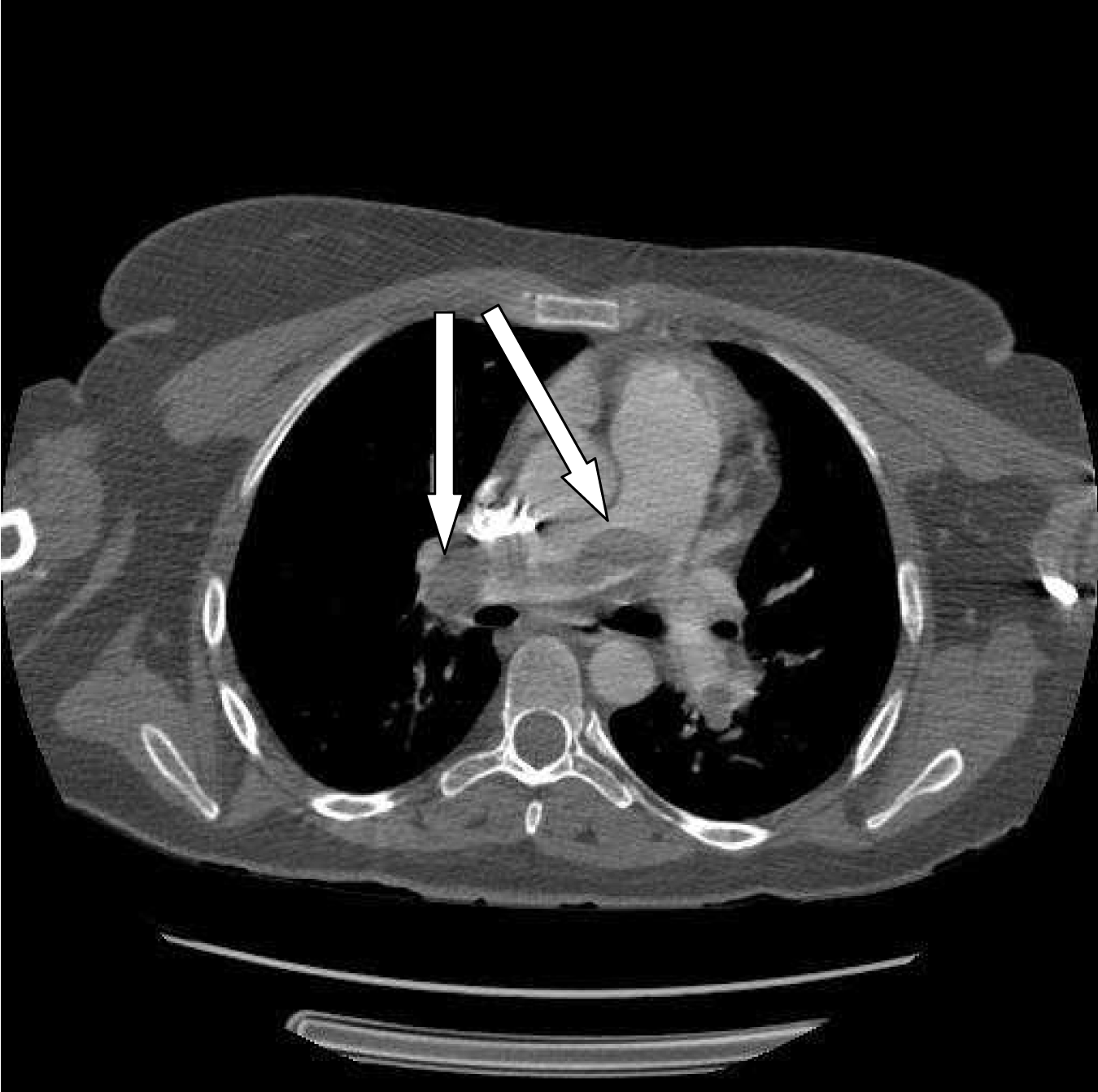 A 33-year-old female presented via ambulance to small community hospital emergency department complaining of feeling weak and dizzy. Two hours prior to calling EMS she began to feel "a funny fluttering in chest" associated with weakness, sweating and near syncope upon standing. She recalled two similar, but less severe episodes over the past week. On questioning, she also reported several episodes of left sided chest pain and dyspnea on exertion over the previous week. Two weeks prior, she had an open reduction and internal fixation of a fractured left metatarsal, with cast immobilization since that time. Other medical history included hypertension, gastroesophageal reflux, and hypercholesterolemia. Medications included lovastatin, lisinopril, esomeprazole, and oxycodone/acetaminophen. She was a non-smoker and family history was unremarkable. Initial examination showed a conscious, alert female in no distress. Her vital signs on arrival included a heart rate of 145 bpm, respiratory rate of 20 bpm, blood pressure 106/60 mmHg, and oxygen saturation of 97% on oxygen via nasal cannula. Oxygen saturations on room air were not recorded prior to EMS providers initiating oxygen therapy. The physical examination revealed a pleasant young woman with mild tachypnea, tachycardia, normal heart and lung examinations, and her left leg in a cast. An electrocardiogram (EKG) showed sinus tachycardia with right axis deviation, but no dysrhythmias or acute ischemic changes. A chest X-ray, complete blood count, electrolytes, and cardiac enzymes (troponin I and creatine phosphokinase) were all within normal limits. The risk of PE was considered to be high so a subcutaneous dose of enoxaparin (1 mg/kg) was administered empirically. She was given a fluid bolus and morphine for chest discomfort. She was transported to the radiology area of the emergency department and spiral computed tomography (CT) angiography was performed of her pulmonary vessels. After completion of the scan, just as the patient was moved back to her stretcher, she lost consciousness and displayed a brief episode of generalized tonic-clonic motor activity. Carotid pulses were not palpable during the episode indicating either cardiac arrest or profound hypotension. During the following 30–60 seconds she was rapidly moved to the emergency department treatment area for resuscitation. However, within those seconds her pulses became palpable, and her mental status and blood pressure rapidly improved and returned to baseline over the next three to five minutes. Review of the CT images obtained moments before showed a large central pulmonary embolism. (Figure 1). A heparin drip was initiated and consent was obtained for systemic fibrinolysis. Tenecteplase 45mg (0.5 mg/kg) was administered intravenously. Approximately fifteen minutes later, the patient had another sudden episode of increased dyspnea, anxiety and chest pressure, followed by a 45-second loss of consciousness with myoclonus and cyanosis of the face and neck. Blood pressure could not be measured but central pulses remained palpable. The cardiac monitor showed sinus tachycardia throughout the episode. Ventilations were assisted with bag valve mask (BVM). The patient again regained consciousness and subsequently stabilized. She was promptly transferred to the intensive care unit of a nearby tertiary care facility by helicopter. Upon arrival at the tertiary facility's ICU the patient displayed normal vital signs and had no further episodes of syncope or hypotension. A transthoracic ultrasound was performed on the next day, showing a dilated right ventricle with paradoxical septal motion. Left ventricular size and function were normal. Lower extremity Doppler studies revealed widespread deep venous thrombosis of the distal left leg and an inferior vena caval filter was placed. Serial cardiac enzymes showed a peak troponin I of 0.39 ng/mL on the second hospital day. Warfarin therapy was initiated and she was discharged home after nine days without neurologic deficits or bleeding complications. On follow-up one year later she continued to do well. | ||||||