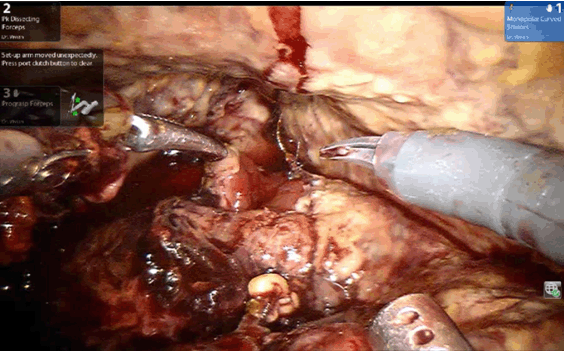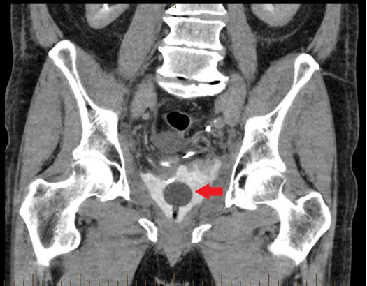 A 68-year-old was male presented to the hospital on day-8 post robot-assisted laparoscopic radical prostatectomy (RALRP) for routine catheter removal and trial of void. He had no other significant medical history and the procedure was performed for Gleason 7 biopsy-proven prostate adenocarcinoma. On admission, he reported feeling unwell for the last two days and passing dark blood-stained urine with debris, but no symptoms of infection were experienced. These symptoms were preceded by an episode of "coughing fits". On examination, the patient was afebrile and his vital signs were within normal range. Cardiopulmonary examination was normal and abdomen was soft and non-tender. The laparoscopic surgical wounds appeared clean and healthy. Pelvic computed tomography scan showed disruption of the anastomosis with the catheter lying within the contrast-filled prostatic cavity (Figure 1). The patient was returned to operating theatre for Da Vinci Si HD (Intuitive Surgical Inc, USA) robot-assisted reconstruction of urethrovesical anastomosis. Intraoperatively, complete urethrovesical anastomosis disruption was evident (Figure 2), and there appeared to be an anastomotic suture breakage and splitting of the bladder neck. The repair process was difficult due to tissue fragility. The anastomosis was repaired with monofilament suture by van Velthoven style; reinforcements with simple interrupted suture were made at 2 o'clock, 5 o'clock, 7 o'clock and 10 o'clock. Patient recovered well postoperatively but anastomotic leak was persistent. The urinary catheter was kept in for four weeks total after which cystogram showed water-tight healing. | ||||||