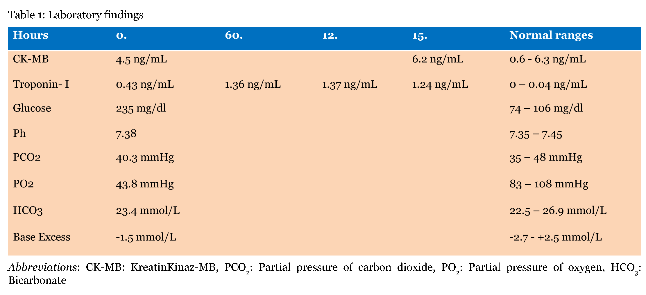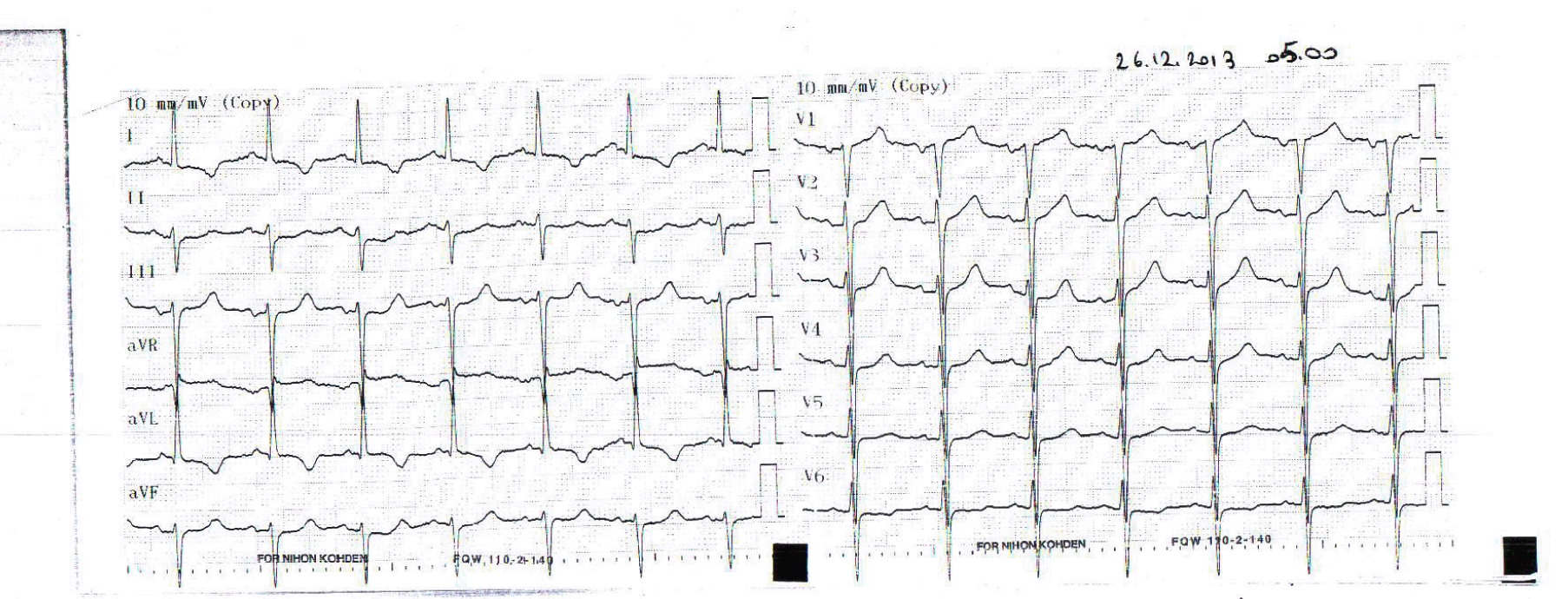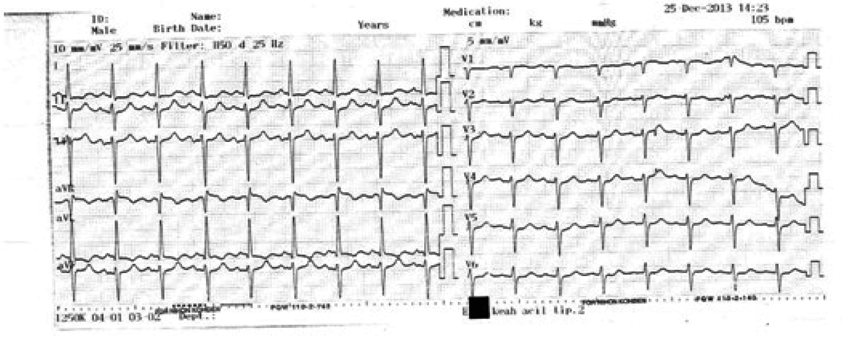 An 84-year-old male admitted to emergency department after intake of a 1000 mg ACA tablet, which had been recommended for upper respiratory infection, with shortness of breath and numbness in the throat complaints ongoing for 30 minutes. Past medical history revealed diabetes, coronary artery disease and hypertension. On admission, TA 110/50 mmHg, pulse rate : 105/min, fever 38.9°C and blood glucose 224 mg/dL. On physical examination, uvula edema, wheezing, rales and rhonchi were present and other systematical examinations were normal. The 12-lead electrocardiogram (ECG) revealed sinusal tachycardia and negative T wave on lead aVL (Figure 1). We administered 0.5 mg adrenaline intramuscularly, 45.5 mg pheniramine, 80 mg methylprednisolone intravenously to the patient, concerning the diagnosis of anaphylaxis. Paracetamol 1 g used for fever management. For bronchoconstriction, 2.5 mg salbutamol was given to him via nebulizer. Laboratory findings are given in Table 1. During follow-up, increase in troponin levels and changes in ECG (Figure 2) were observed and the patient was consulted to cardiologist with a pre-diagnosis of Kounis syndrome. Echocardiographic examination revealed normal left ventricular systolic function, diastolic dysfunction grade 1 and EF %60. Troponin levels were lower at follow-up, was not planned coronary angiographic intervention. Uvula edema regressed, no fever or ECG changes detected and Troponin levels decreased and patient was discharged after a 24-hour follow-up without any complication. | ||||||