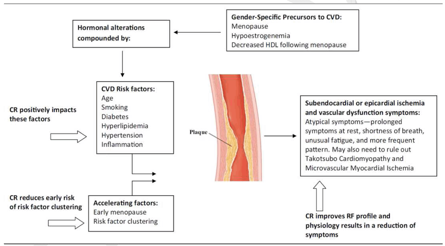 The patient had the general characteristic features of CSX, including angina, evidence of myocardial ischemia and no obstructive CAD by coronary angiography. These findings along with further evaluation and abnormal coronary reactivity testing indicated the specific diagnosis of ischemic cardiomyopathy with microvascular angina secondary to CMD. She was able to increase exercise intensity from 2.1 to 3.3 METs after four sessions of CR program without abnormal chest pain and arrhythmia. While the exercise duration was optimal at 45–50 minutes, low exercise intensity and poor functional capacity were observed. Ideally, a supervised CR program should have been continued but she could not complete a full program of 36 sessions. Home CR program played a key role in this patient, including aerobic exercise, strengthening exercise, stress management technique and healthy heart diet intake. As a multifaceted structured program that encourages exercise, education, nutrition counseling and psychosocial intervention, CR provides a therapeutic opportunity in CSX and microvascular angina patients (Figure 3) [8]. Eriksson et al revealed that there was improvement in exercise capacity by 34%, delayed onset of chest pain during exercise by 100% and tendency to increased endothelium-dependent blood flow in CSX after eight weeks of aerobic exercise [9]. Moreover, the eight-week CR program was shown to modify cardiovascular risk factors, including lower resting diastolic blood pressure and body mass index, improved physical fitness from Shuttle Walk Test performance, reduced symptom severity and improved QOL in CSX patients [10]. In microvascular angina patients, Carvalho et al. reported a case with improved endothelium-dependent vasodilator response of brachial artery, reversal of the ischemic myocardial perfusion defect from single-photon emission computed tomography, improved angina symptoms and QOL after the four-month aerobic training [11]. Our report showed the benefits of CR, including increased exercise intensity, exercise duration, improved functional capacity and decreased anginal symptoms in this patient with proven microvascular angina. Women with CSX often have impaired functional capacity and/or are deconditioned. The DASI is a 12-item self-reported questionnaire that captures functional capacity. The DASI score is validated to estimate maximal oxygen consumption from exercise stress test. By dividing the DASI score by 3.5, METs are derived. The application of DASI might be used instead of exercise stress test to identify at-risk symptomatic women, predict prognosis and target risk management. Among symptomatic women with suspected myocardial ischemia from the NHLBI-WISE study, functional impairment measured by the exercise stress test and DASI-estimated METs =4.7 correlated with an adverse prognosis, including higher death and nonfatal myocardial infarction rates [7]. Notably, even small increases in functional capacity after CR participation could reduce cardiovascular mortality and morbidity. In a retrospective review in women referred for stress testing, for every MET increase in exercise capacity, there was a 25% reduction in the rate of all-cause death [12]. Our patient also reported functional capacity improvement, demonstrated by 3.4 METs increase of DASI score at the fourth-year of follow-up, which suggests better prognosis. In terms of QOL, the eight-week CR program improved QOL scales in women with CSX based on a SF-36 questionnaire [10] [13]. Similarly, a slight increase of a general QOL rating scale and improved overall health status was reported in our patient at the four-year follow-up. Although CR is recommended for all patients with CAD and chronic angina, participation rate is low especially in women [14]. Women are faced with several barriers to CR attendance, including caregiving responsibilities observed in our patient. Referral of women to CR should be strongly considered by physicians, as it positively affects physical and psychological outcomes in patients with CSX, MCD and microvascular angina. | ||||||