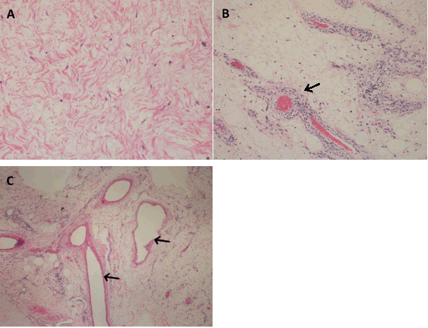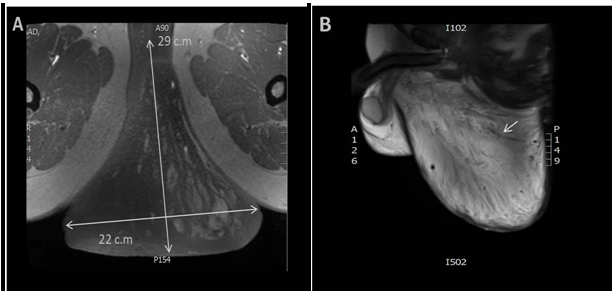 A 45-year-old male presented with a swelling in the perianal area that had begun to grow four months previously. He complained of pain, and problems defecating. Physical examination located a soft lump in the perianal area, with ill-define edges near to the posterior midline (Figure 1). Although it is a rare condition, one of our preliminary differential diagnoses was lipomas. Other differential diagnosis was possible Desmoids Type Tumor. Magnetic resonance imaging (MRI) scan of the pelvis showed a large flask shaped mass sagging from the perineum, with fat lobules apparently originating from perineum, extending into the intergluteal cleft. There was concern about the swirled appearance noted post contrast study, which suggested possible diagnosis of a myxoid type tumor and less likely a lipoma (Figure 2A-B). Surgical excision of the mass was performed. The gross appearance of the specimen was a disoriented mushroom shaped mass, about 380 grams in weight, with a fatty cut surface (Figure 3). Microscopically, it showed an ill-defined tumor composed of small spindle cells embedded in an abundant myxoid stroma interspersed with a thick wall and hyalinized blood vessels. There was no evidence of mitotic activity or nuclear atypia (Figure 4A-C). Based on these histological features, a diagnosis of aggressive angiomyxoma (AAM) was confirmed. | ||||||