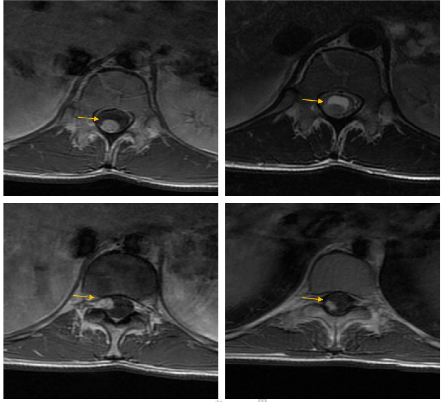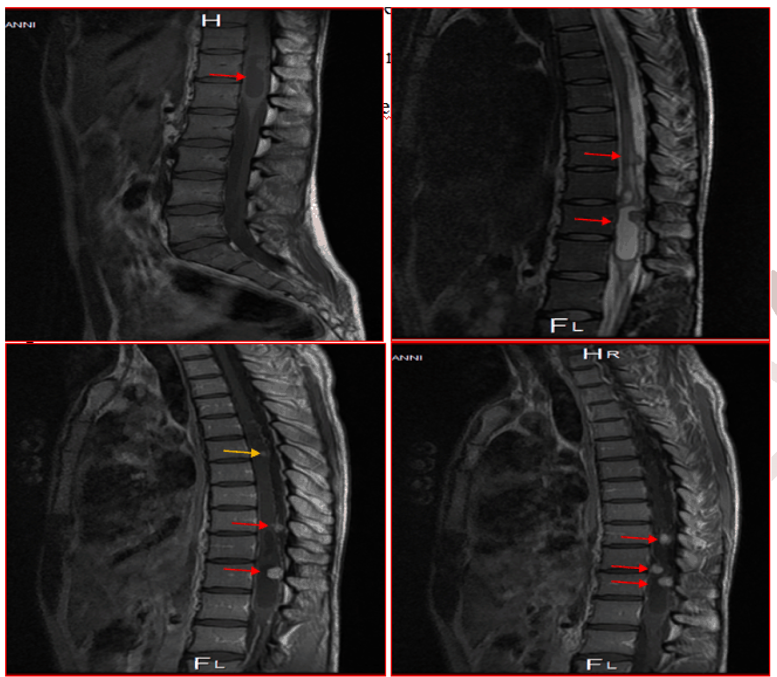 Figure 1: Magnetic resonance imaging scan of the spine showing multiple intramedullary masses. The symptomatic lesions was situated in the terminal cone (red arrow); the largest mass measured 48×13×10 mm in size. The mass appeared as a cystic lesion with a tissural mural nodule, with hypointense T1 inhomogeneous signal, with increased gadolinium uptake in T1.