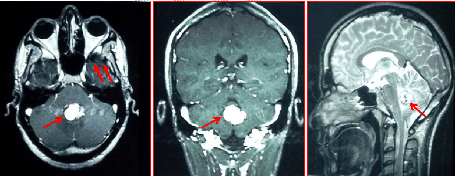 Figure 3: Magnetic resonance imaging scan of the brain showing a vermian hemangioblastoma associated with 2 small right cerebellar hemangioblastomas.
