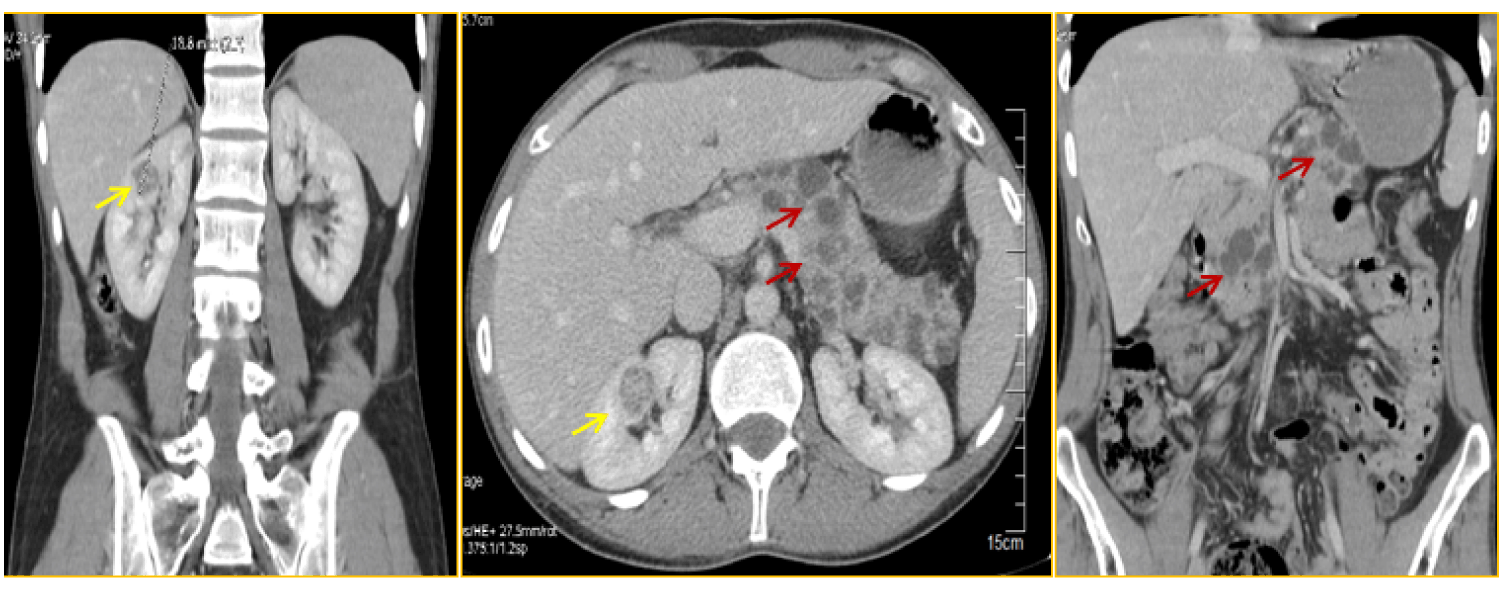 Figure 4: The abdominal computed tomography scan revealing two small renal masses (yellow arrow), less than 2 cm in size; with multiple pancreatic cysts (red arrow).