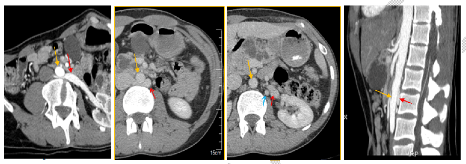 Figure 5: Computed tomography showing compression of the left renal vein (red arrow) between abdominal aorta (yellow arrow) and vertebral column with dilatation of the spermatic vein (blue arrow).