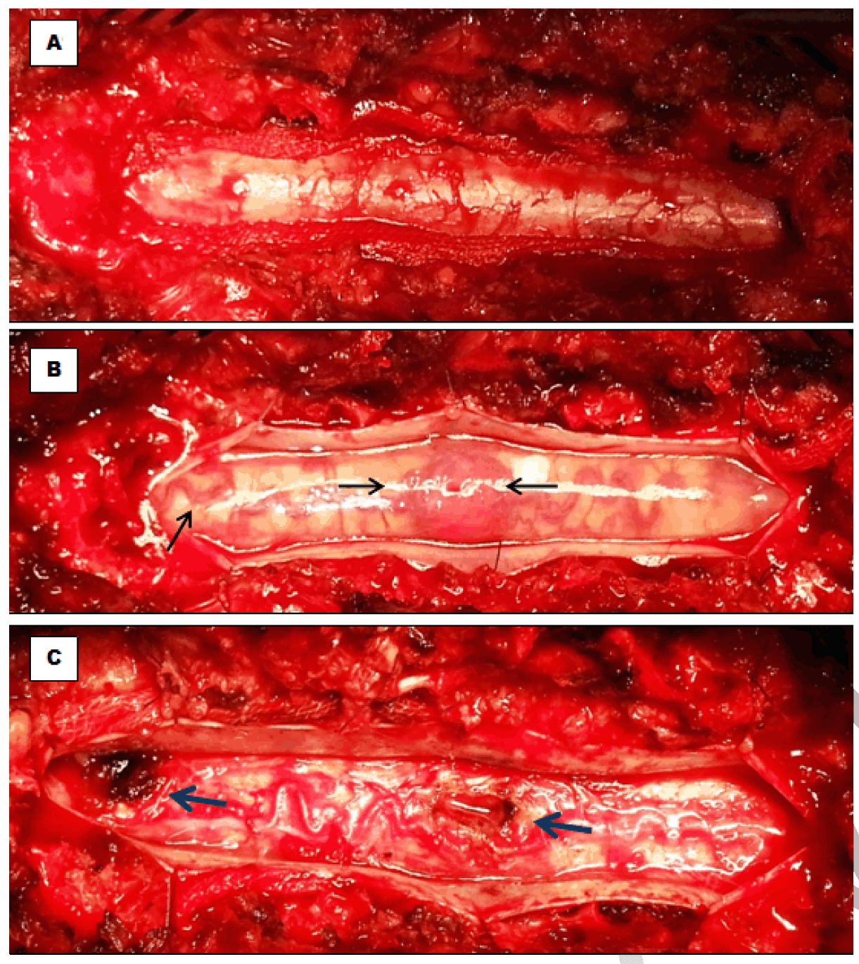 Figure 6: Intraoperative view of a intramedullary hemangioblastoma in the spinal cord (A) Before the duralinsision, (B) After the duralinsision, and (C) After complete resection.