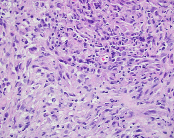 Figure 2: Liver core biopsy showing high grade malignant neoplasm consistent with epitheloid mesothelioma. Immunoperoxidase stain for inhibin, CAM 5.2, CK7, calretinin, WT1 were positive. This malignant neoplasm is histologically distinct from the patient's rectal adenocarcinoma and represents a synchronous secondary primary neoplasm.