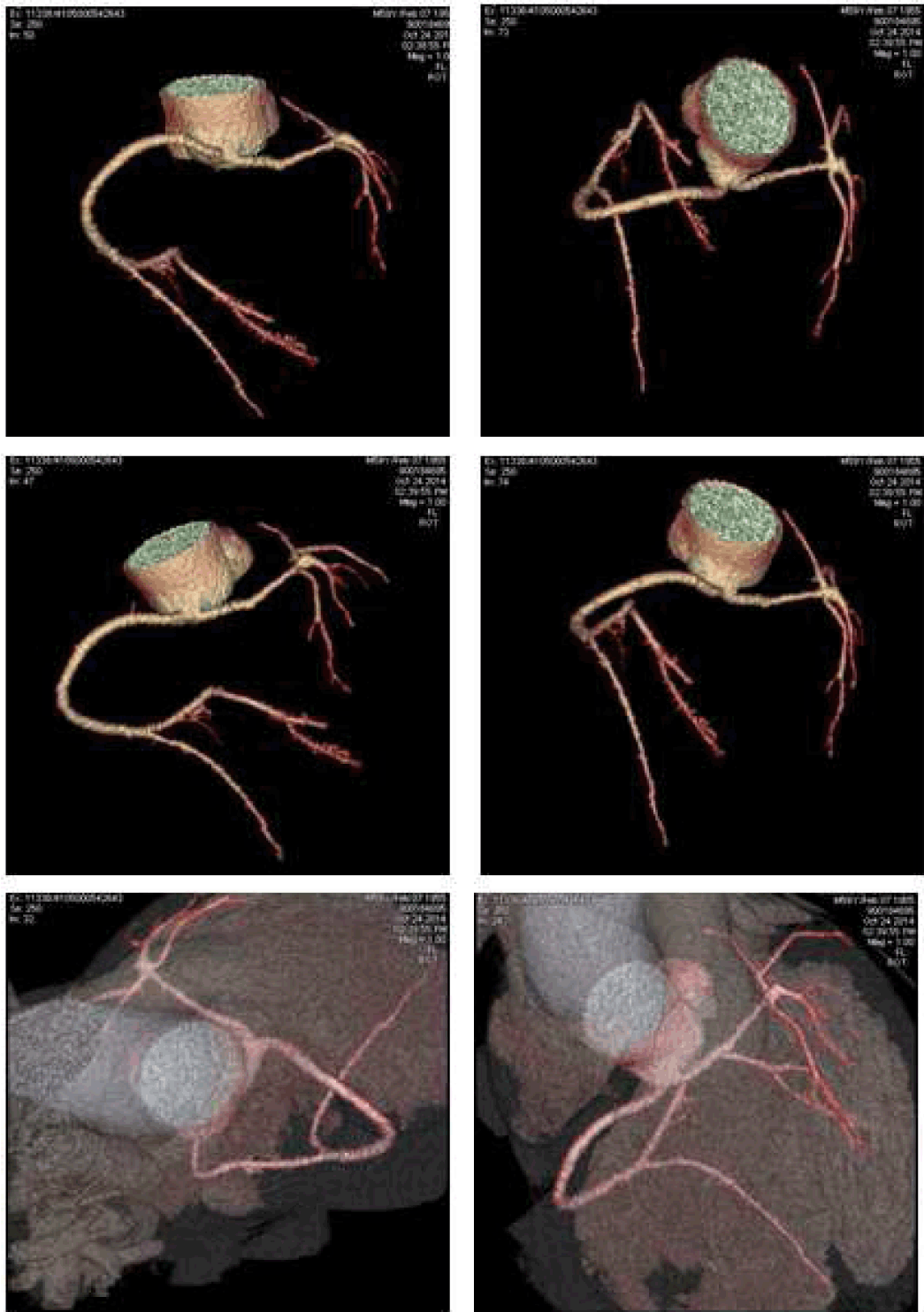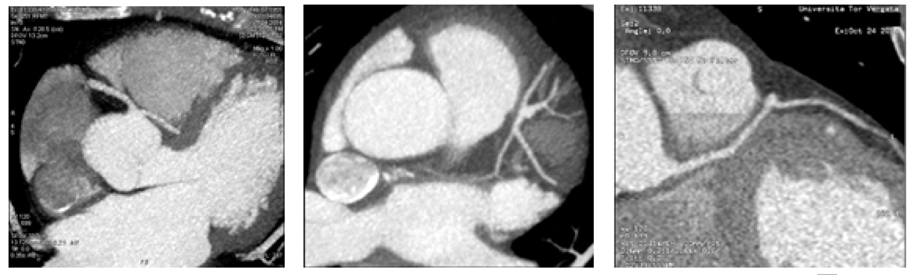 Coronary angiography evaluation has demonstrated an anomalous vascular anatomy with absence of coronary ostium in left cusp of the aortic valve. Computed tomography (CT) scanning has confirmed the anomalous origin and course of coronary vessels showing also an inter-arterial course of the CT between the pulmonary artery and the aorta. A 2-cm segment of the proximal-middle tract of the CT was embedded within the inter-ventricular septum, following an intramural course with a relative reduction of tunneled vessel. Thin bridges can be not demonstrable angiography, so anatomic and panoramic CT-evaluation give more information especially if associated with functional evaluation. Knowledge of physiology, normal and variant anatomy, is most important in managing congenital and acquired disease, and variation in coronary arterial patterning is frequent. |