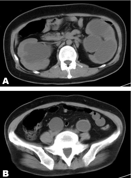 A 34-year-old female came to our hospital with complaints of anorexia and malaise that had persisted for approximately 10 days. She did not have abdominal or back tenderness, and her skin was dry. Her systolic blood pressure was 76 mmHg, and laboratory tests revealed an elevated creatinine level of 6.41 mg/dl, potassium level of 8.4 mEq/l, white blood cell count of 28,000/µl and C-reactive protein level of 17.98 mg/dl. She was admitted with diagnoses of urinary tract infection, acute kidney injury and hyperkalemia. At birth, she was diagnosed of schistorrhachis (Figure 1), and therefore, self-catheterization was performed. Abdominal computed tomography scan showed bilateral megaureters and hydronephrosis (Figure 2). Cystoscopy showed ends of both the ureters opening into the bladder. As her blood tests were abnormal (pH 7.360, serum HCO3 11.4 mmol/l), we performed hemodialysis once. Moreover, double J stents were placed in the ureters and antibiotic prophylaxis was administered. After treatment, her symptoms improved and blood tests became normal, and she was discharged. Based on this history, we diagnosed her as a case of neuropathic bladder secondary to schistorrhachis. | ||||||