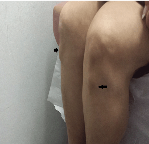 Bilateral enlargement or hypertrophy of the tibial tuberosities (tubercles) is seen in our patient who previously had been diagnosed with sternoclavicular hyperostosis [1]. Our patient presented with these symptoms of approximately six months duration with no further increase in size. The tubercles (Figure 1) were moderately painful to touch with no warmth or erythema. The patient is a 49-year-old female with a history of hypertension and hypertriglyceridemia and osteoarthritic joint pain. Her medications included: tramadol 50 mg every six hours as needed, lisinopril 20 mg daily, hydrochlorothiazide 12.5 mg daily and fenofibrate 145 mg daily. Examination showed no fever or lymphadenopathy at any site. Both tubercles were enlarged right greater than left with generalized tenderness at the site of the tubercle but no pain at any other site around the knee. The patient had no history of Osgood-Schlatter disease as an adolescent. There were no recent infections and once enlarged there was no further growth of the lesions. Prior radiographic imaging of the sternoclavicular joint demonstrated no evidence of tumor or infection. Her laboratory studies were unremarkable [1]. The patient was treated with heat alternating with cold packs for 15 minutes four times daily along with meloxicam 15 mg daily. The patient could not afford a patellar band. The patient has ongoing diffuse idiopathic skeletal hyperostosis (DISH). | ||||||